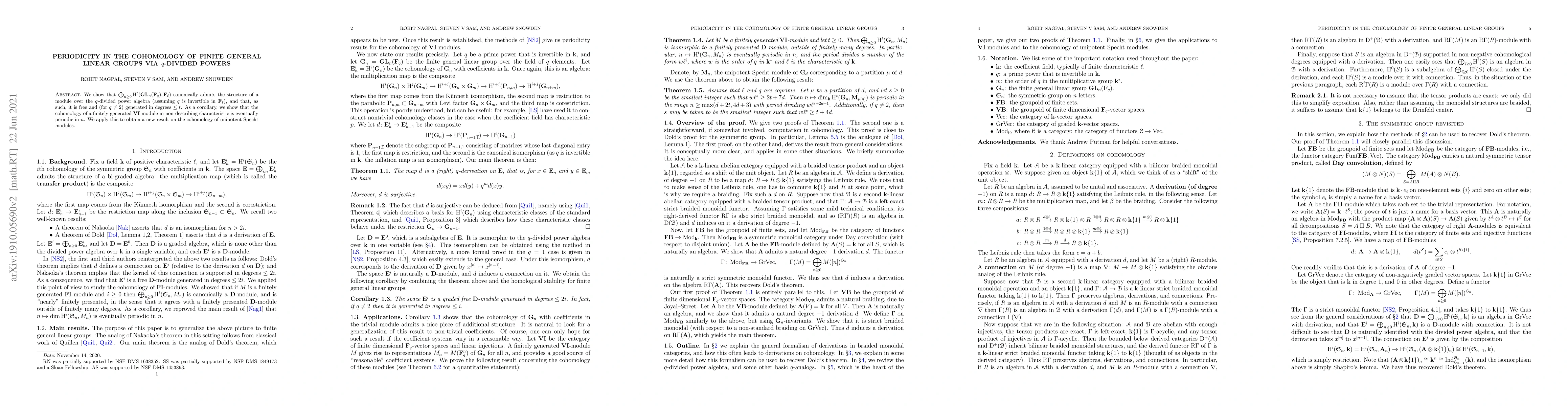 This paper demonstrates that the cohomology of finite general linear groups over finite fields exhibits periodicity when structured as a module over the $q$-divided power algebra, proving it is free and generated in specific degrees. This result also implies eventual periodicity in the cohomology of finitely generated modules in non-describing characteristic.