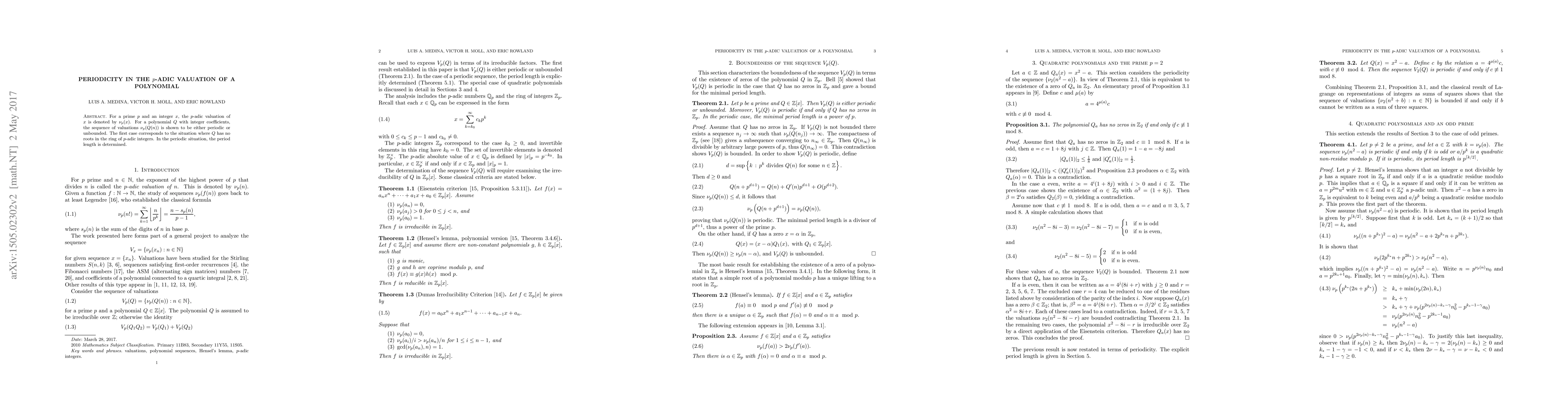 The paper investigates the $p$-adic valuation of integer values of a polynomial $Q$ and demonstrates that the sequence $\nu_{p}(Q(n))$ is either periodic or unbounded, with periodicity arising when $Q$ has no roots in the $p$-adic integers. The length of the periodicity is also determined.