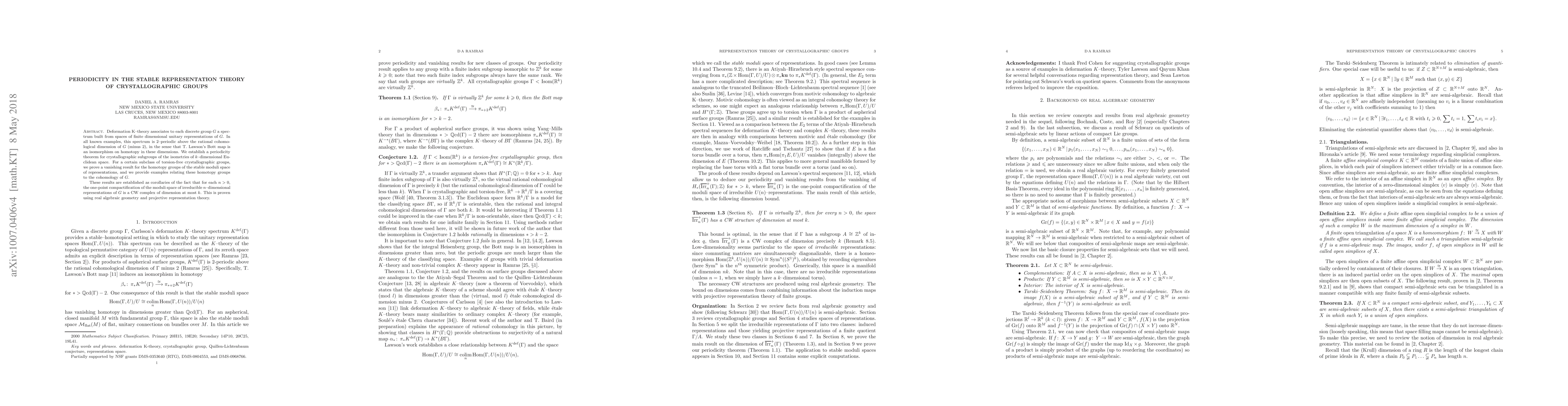 This paper establishes a periodicity theorem for the stable representation theory of crystallographic groups, proving that their deformation K-theory exhibits 2-periodicity above a certain threshold. It also shows a vanishing result for homotopy groups of their stable moduli spaces, linking these to the group's cohomology.