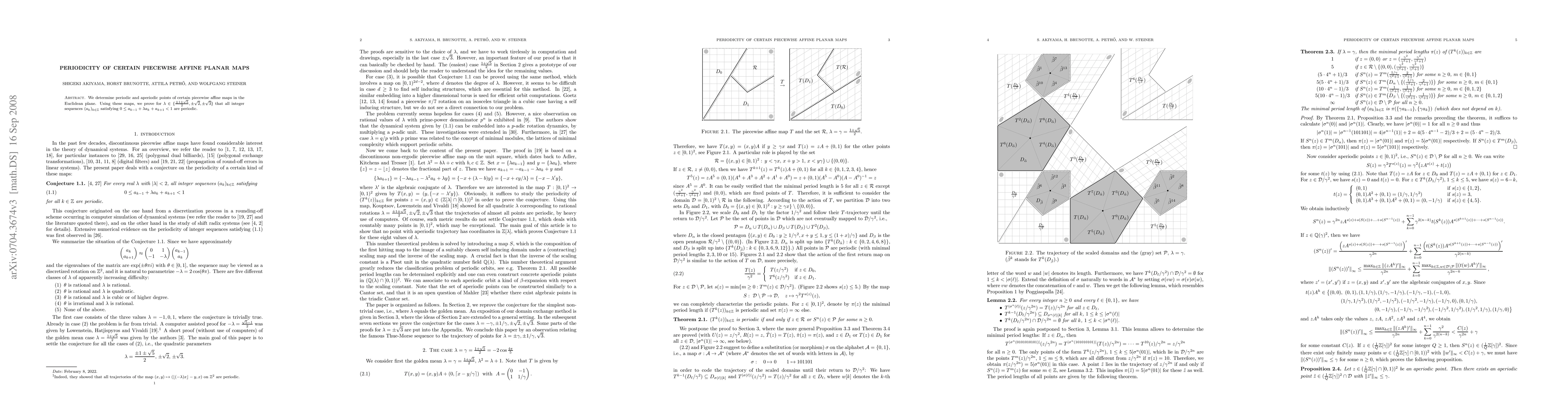 We determine periodic and aperiodic points of certain piecewise affine maps in the Euclidean plane. Using these maps, we prove for $\lambda\in\{\frac{\pm1\pm\sqrt5}2,\pm\sqrt2,\pm\sqrt3\}$ that all integer sequences $(a_k)_{k\in\mathbb Z}$ satisfying $0\le a_{k-1}+\lambda a_k+a_{k+1}<1$ are periodic.