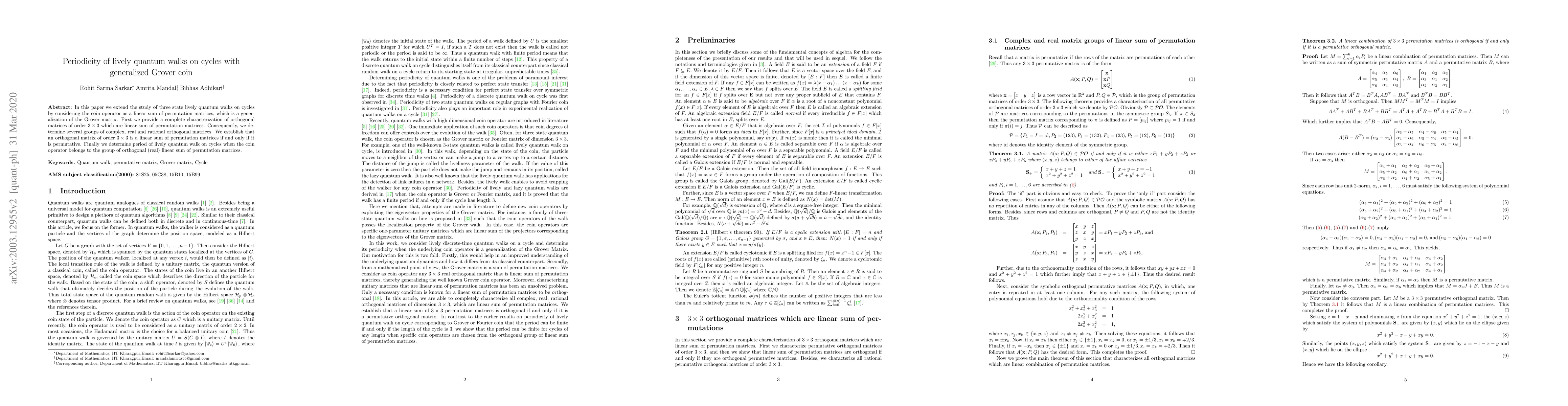 This paper characterizes $3\times 3$ orthogonal matrices that are linear sums of permutation matrices, identifying them as permutative. It then determines the periodicity of lively quantum walks on cycles using a generalized Grover coin operator based on these matrices.