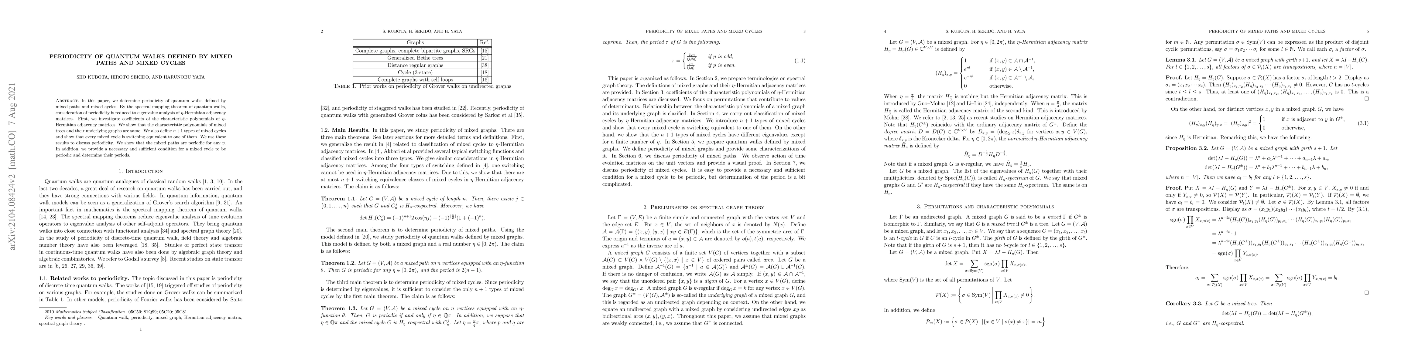 This paper investigates the periodicity of quantum walks defined by mixed paths and cycles, reducing the study to eigenvalue analysis of $\eta$-Hermitian adjacency matrices. It establishes that characteristic polynomials of mixed trees and their underlying graphs are identical and categorizes mixed cycles into $n+1$ types, proving all are switching equivalent to one of these types, which aids in determining periodicity.