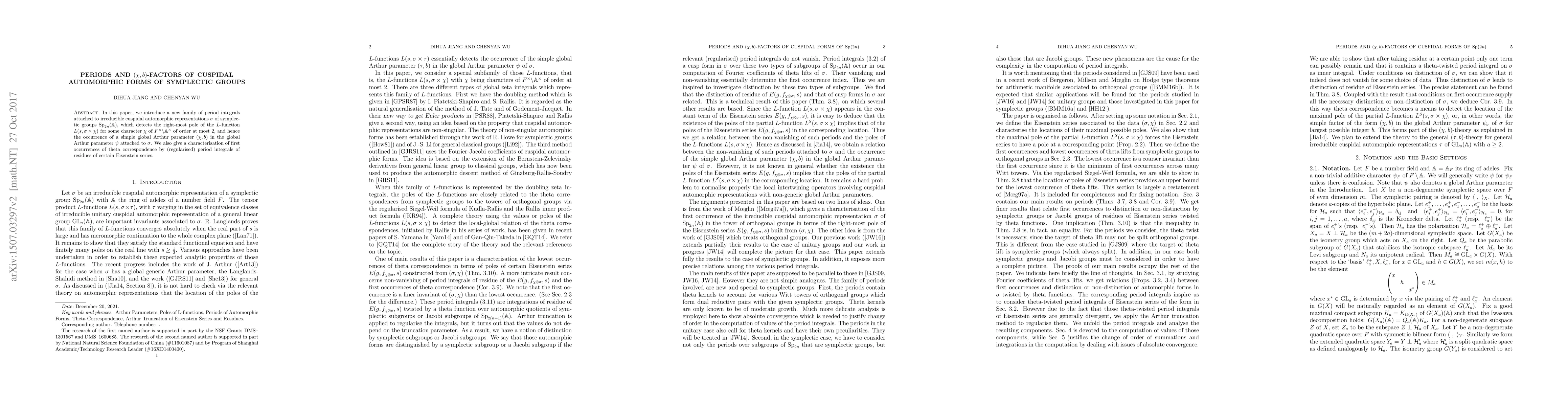 In this paper, we introduce a new family of period integrals attached to irreducible cuspidal automorphic representations $\sigma$ of symplectic groups $\mathrm{Sp}_{2n}(\mathbb{A})$, which detects the right-most pole of the $L$-function $L(s,\sigma\times\chi)$ for some character $\chi$ of $F^\times\backslash\mathbb{A}^\times$ of order at most $2$, and hence the occurrence of a simple global Arthur parameter $(\chi,b)$ in the global Arthur parameter $\psi$ attached to $\sigma$. We also give a characterisation of first occurrences of theta correspondence by (regularised) period integrals of residues of certain Eisenstein series.
