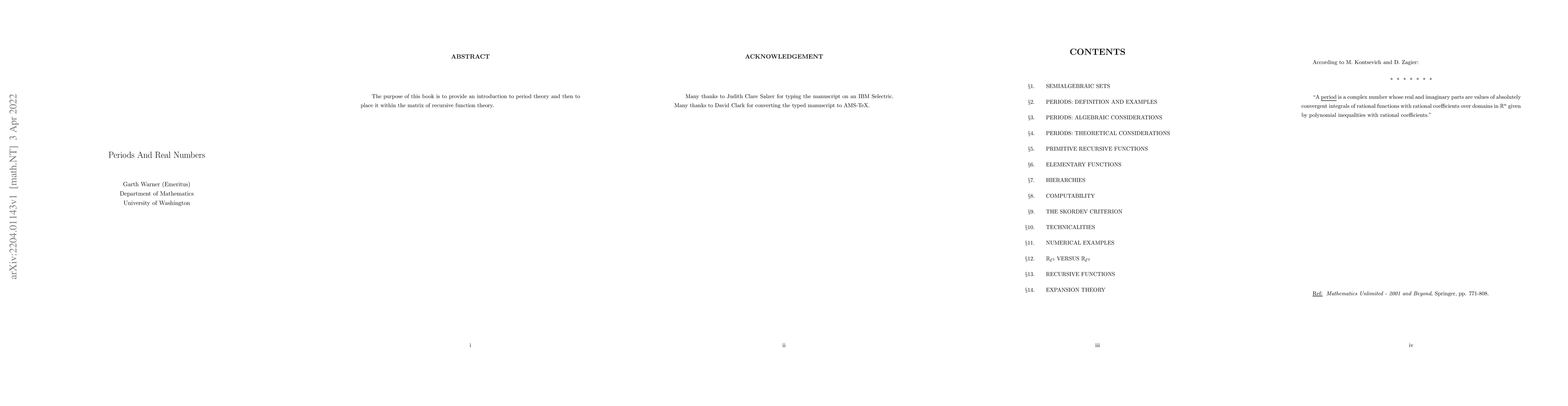 The purpose of this book is to provide an introduction to period theory and then to place it within the matrix of recursive function theory.