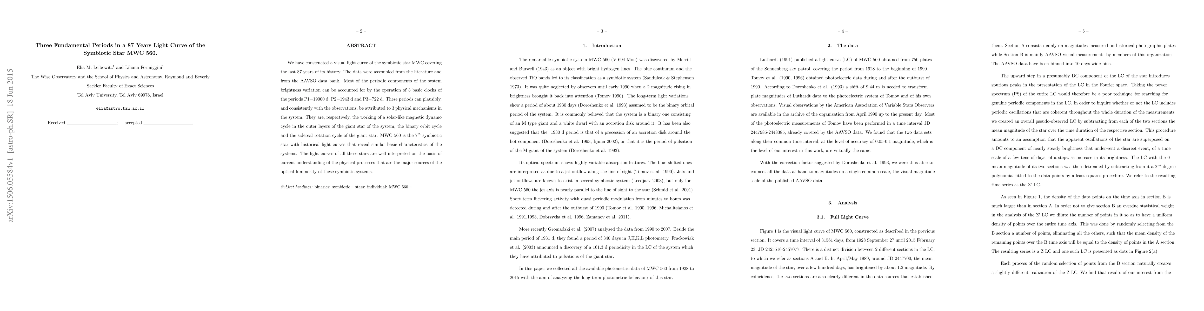This paper presents an 87-year visual light curve of the symbiotic star MWC 560, revealing periodic brightness variations attributed to three main periods: P1=19000 d, P2=1943 d, and P3=722 d, corresponding to a magnetic dynamo cycle, binary orbit, and rotation cycle, respectively. The findings align with current understanding of the physical processes driving the optical luminosity in symbiotic stars, positioning MWC 560 among the few with similarly characterized historical light curves.