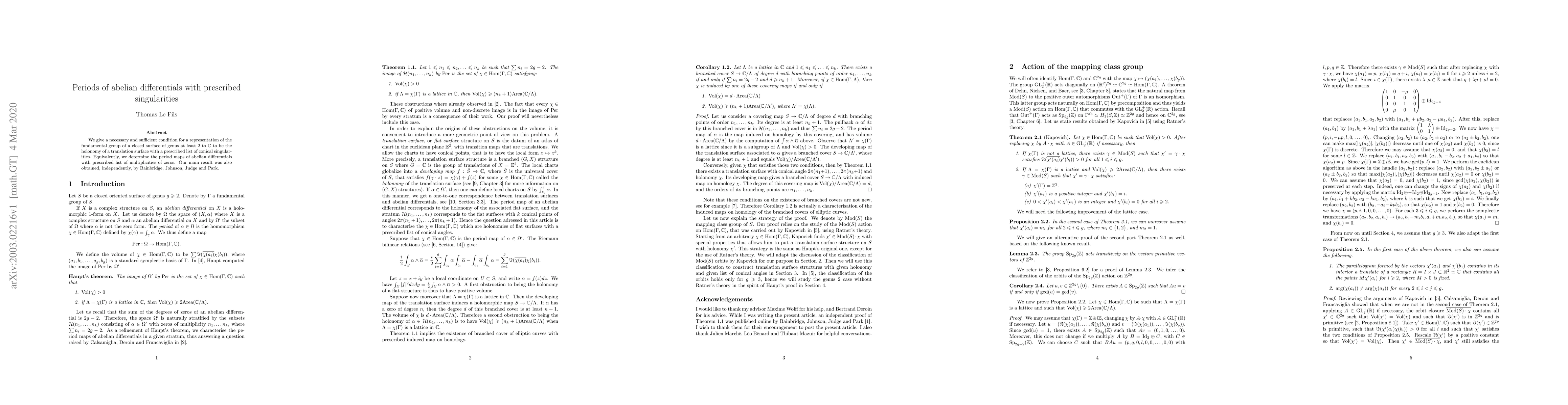 We give a necessary and sufficient condition for a representation of the fundamental group of a closed surface of genus at least 2 to $\mathbb C$ to be the holonomy of a translation surface with a prescribed list of conical singularities. Equivalently, we determine the period maps of abelian differentials with prescribed list of multiplicites of zeros. Our main result was also obtained, independently, by Bainbridge, Johnson, Judge and Park.