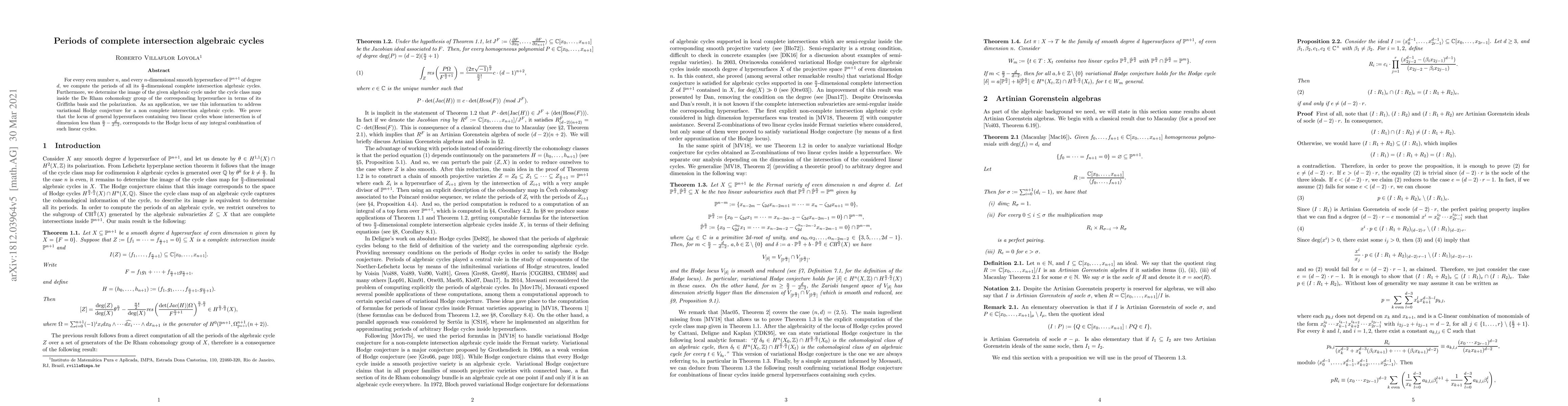 This paper computes the periods of $\frac{n}{2}$-dimensional complete intersection algebraic cycles in even-dimensional smooth hypersurfaces of $\mathbb{P}^{n+1}$ and determines their image in De Rham cohomology. It applies this to address the variational Hodge conjecture for non-complete intersection cycles.