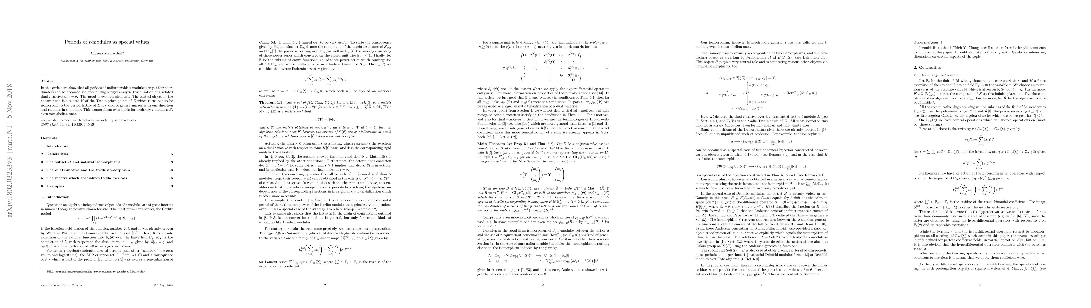 This paper demonstrates that the periods of uniformizable $t$-modules can be derived by specializing a rigid analytic trivialization of a dual $t$-motive at $t=\theta$. The central construction involves a subset $H$ of the Tate algebra points that is isomorphic to the period lattice via generating series and residues.