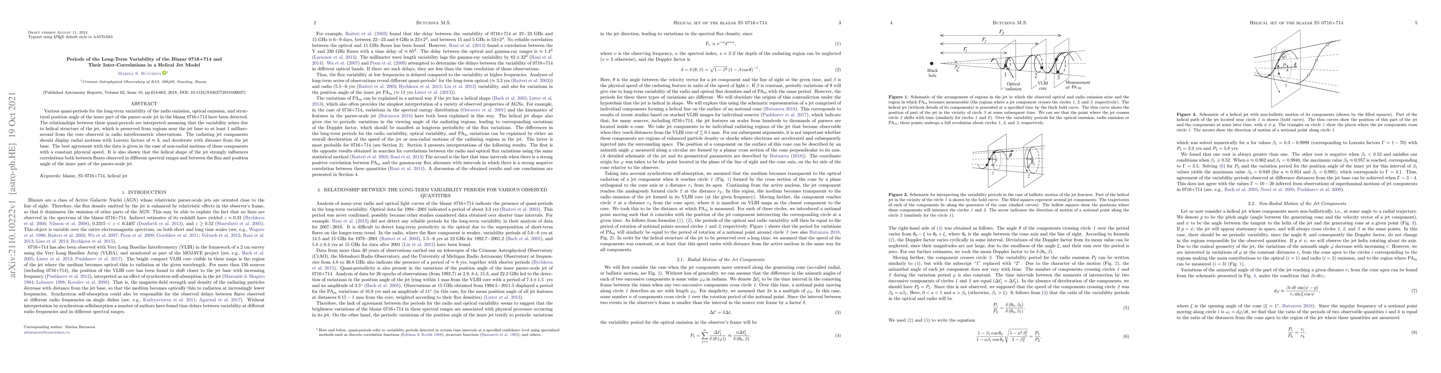 Various quasi-periods for the long-term variability of the radio emission, optical emission, and structural position angle of the inner part of the parsec-scale jet in the blazar 0716+714 have been detected. The relationships between these quasi-periods are interpreted assuming that the variability arises due to a helical structure of the jet, which is preserved from regions near the jet base to at least 1 milliarcsecond from the core observed in radio interferometric observations. The radiating jet components should display radial motions with Lorentz factors of $\approx3$, and decelerate with distance from the jet base. The best agreement with the data is given in the case of non-radial motions of these components with a constant physical speed. It is also shown that the helical shape of the jet strongly influences correlations both between fluxes observed in different spectral ranges and between the flux and position angle of the inner part of the parsec-scale jet.