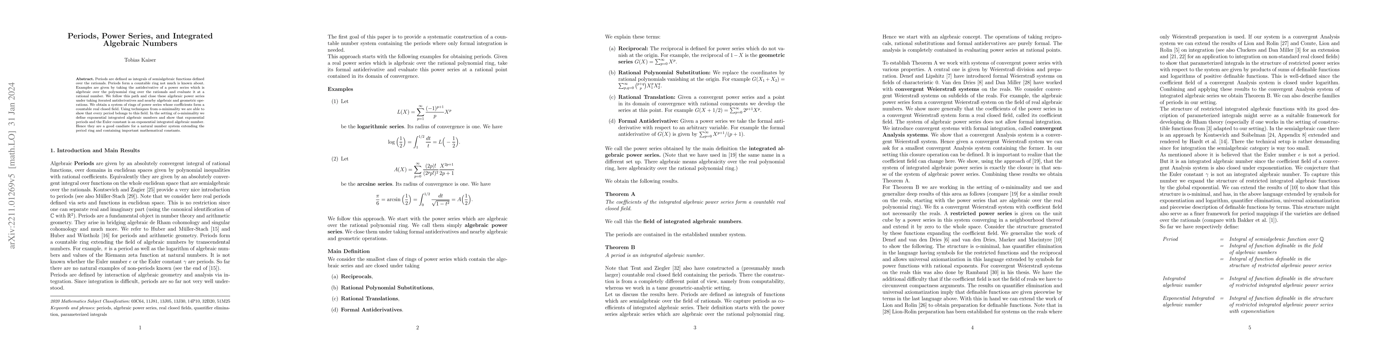 This paper explores periods, defined as integrals of semialgebraic functions over the rationals, and constructs a countable ring of such periods. It demonstrates that every period belongs to a countable real closed field formed by iterated antiderivatives of algebraic power series, and introduces exponential integrated algebraic numbers, showing the Euler constant as an example.