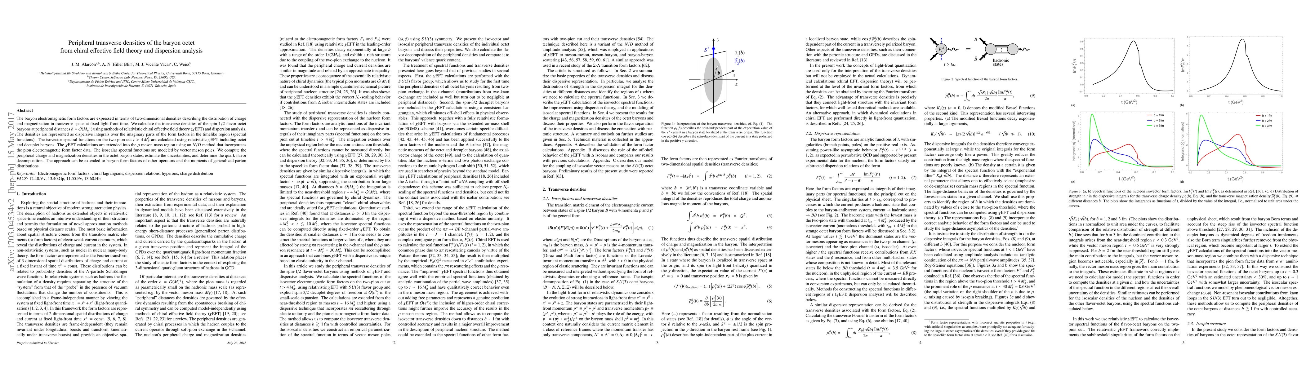 This paper calculates the peripheral transverse densities of the spin-1/2 flavor-octet baryons using relativistic chiral effective field theory and dispersion analysis, representing the densities as dispersive integrals over spectral functions derived from pion electromagnetism and vector meson poles. The study estimates uncertainties and provides quark flavor decomposition for these densities.