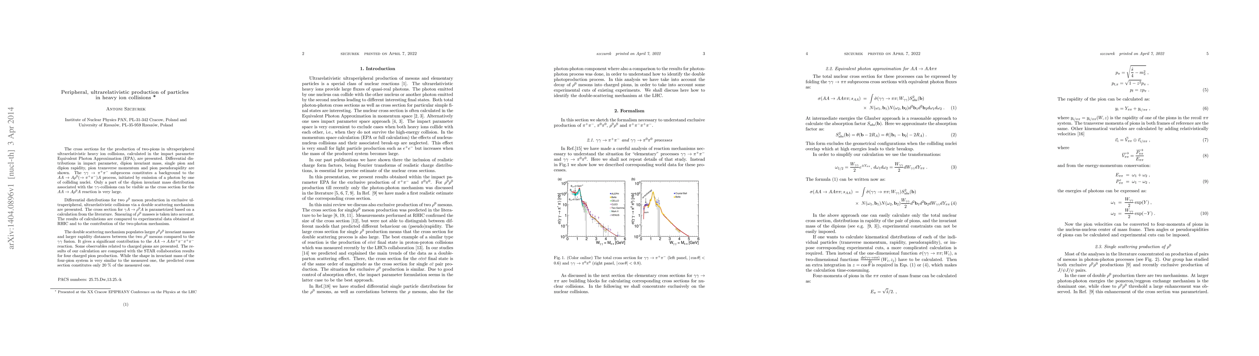 The cross sections for the production of two-pions in ultraperipheral ultrarelativistic heavy ion collisions, calculated in the impact parameter Equivalent Photon Approximation (EPA), are presented. Differential distributions in impact parameter, dipion invariant mass, single pion and dipion rapidity, pion transverse momentum and pion pseudorapidity are shown. The $\gamma \gamma \to \pi^+ \pi^-$ subprocess constitutes a background to the $A A \to A \rho^0 (\to \pi^+ \pi^-) A$ process, initiated by emission of a photon by one of colliding nuclei. Only a part of the dipion invariant mass distribution associated with the $\gamma\gamma$-collisions can be visible as the cross section for the $A A \to A \rho^0 A$ reaction is very large. Differential distributions for two $\rho^0$ meson production in exclusive ultraperipheral, ultrarelativistic collisions via a double scattering mechanism are presented. The cross section for $\gamma A \to \rho^0 A$ is parametrized based on a calculation from the literature. Smearing of $\rho^0$ masses is taken into account. The results of calculations are compared to experimental data obtained at RHIC and to the contribution of the two-photon mechanism. The double scattering mechanism populates larger $\rho^0 \rho^0$ invariant masses and larger rapidity distances between the two $\rho^0$ mesons compared to the $\gamma \gamma$ fusion. It gives a significant contribution to the $A A \to A A \pi^+ \pi^- \pi^+ \pi^-$ reaction. Some observables related to charged pions are presented. The results of our calculation are compared with the STAR collaboration results for four charged pion production. While the shape in invariant mass of the four-pion system is very similar to the measured one, the predicted cross section constitutes only 20 \% of the measured one. \end{abstract}