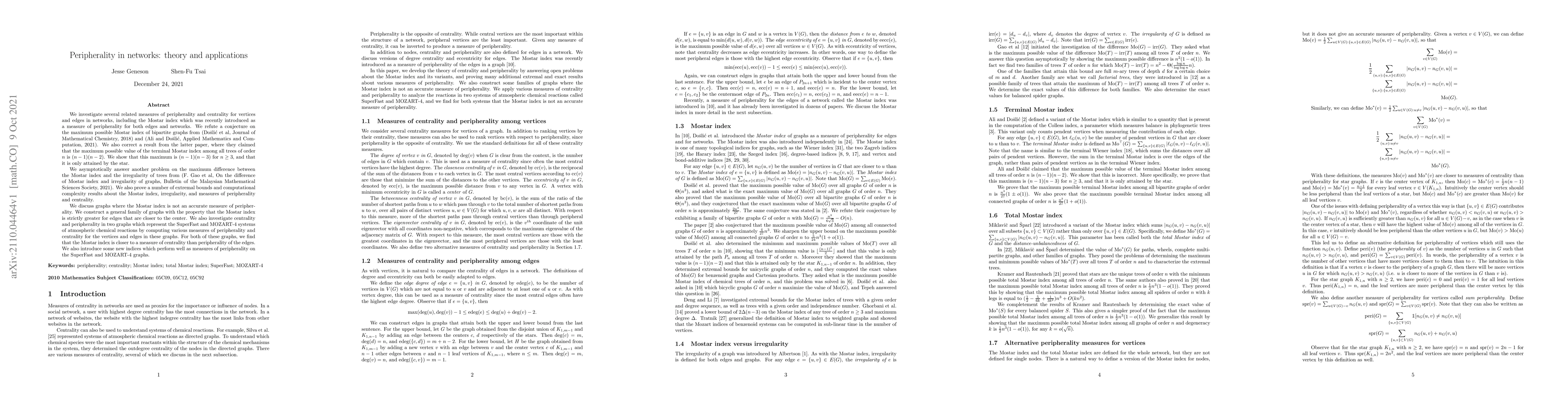 We investigate several related measures of peripherality and centrality for vertices and edges in networks, including the Mostar index which was recently introduced as a measure of peripherality for both edges and networks. We refute a conjecture on the maximum possible Mostar index of bipartite graphs from (Do\v{s}li\'{c} et al, Journal of Mathematical Chemistry, 2018) and (Ali and Do\v{s}li\'{c}, Applied Mathematics and Computation, 2021). We also correct a result from the latter paper, where they claimed that the maximum possible value of the terminal Mostar index among all trees of order $n$ is $(n-1)(n-2)$. We show that this maximum is $(n-1)(n-3)$ for $n \ge 3$, and that it is only attained by the star. We asymptotically answer another problem on the maximum difference between the Mostar index and the irregularity of trees from (F. Gao et al, On the difference of Mostar index and irregularity of graphs, Bulletin of the Malaysian Mathematical Sciences Society, 2021). We also prove a number of extremal bounds and computational complexity results about the Mostar index, irregularity, and measures of peripherality and centrality. We discuss graphs where the Mostar index is not an accurate measure of peripherality. We construct a general family of graphs with the property that the Mostar index is strictly greater for edges that are closer to the center. We also investigate centrality and peripherality in two graphs which represent the SuperFast and MOZART-4 systems of atmospheric chemical reactions by computing various measures of peripherality and centrality for the vertices and edges in these graphs. For both of these graphs, we find that the Mostar index is closer to a measure of centrality than peripherality of the edges. We also introduce some new indices which perform well as measures of peripherality on the SuperFast and MOZART-4 graphs.
