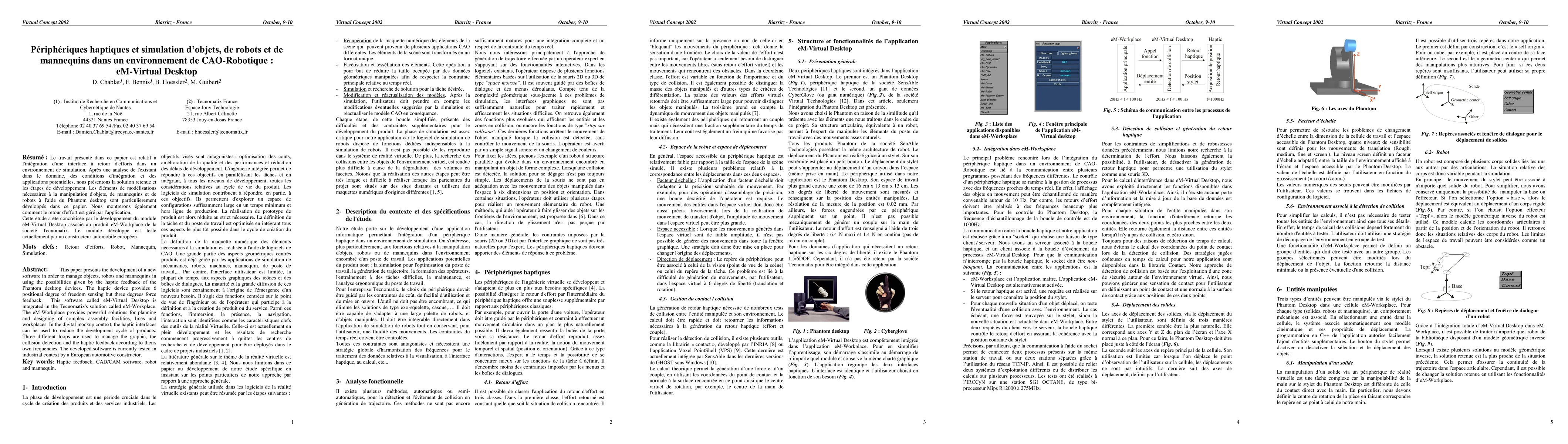 This paper introduces eM-Virtual Desktop, a software for managing objects, robots, and mannequins using haptic feedback from Phantom desktop devices, integrated into Tecnomatix's eM-Workplace for advanced assembly planning and design. The software employs three loops for managing graphics, collision detection, and haptic feedback, currently tested by an automotive constructor.