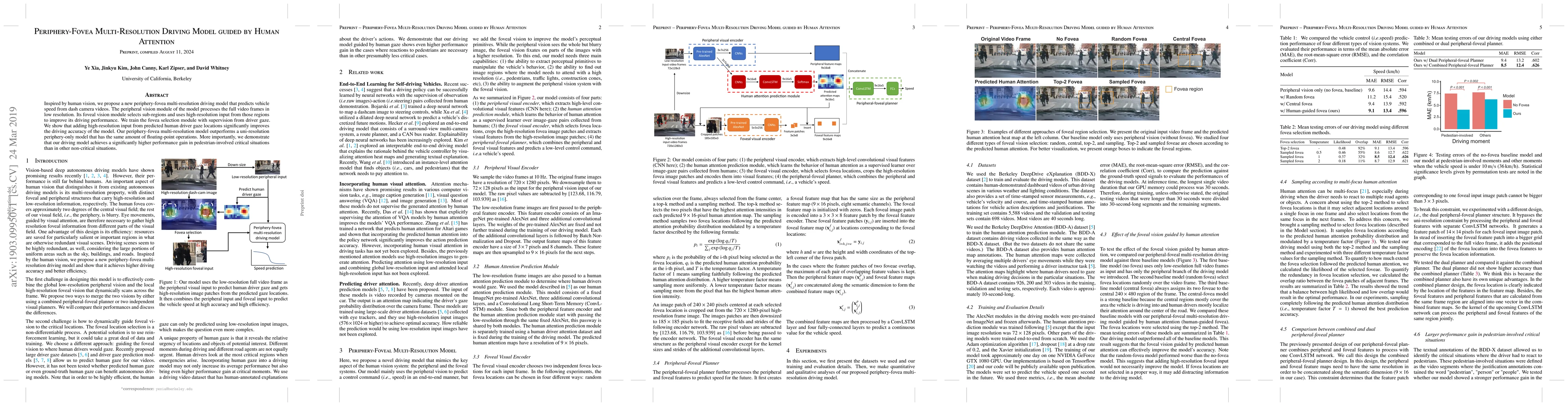 Inspired by human vision, we propose a new periphery-fovea multi-resolution driving model that predicts vehicle speed from dash camera videos. The peripheral vision module of the model processes the full video frames in low resolution. Its foveal vision module selects sub-regions and uses high-resolution input from those regions to improve its driving performance. We train the fovea selection module with supervision from driver gaze. We show that adding high-resolution input from predicted human driver gaze locations significantly improves the driving accuracy of the model. Our periphery-fovea multi-resolution model outperforms a uni-resolution periphery-only model that has the same amount of floating-point operations. More importantly, we demonstrate that our driving model achieves a significantly higher performance gain in pedestrian-involved critical situations than in other non-critical situations.