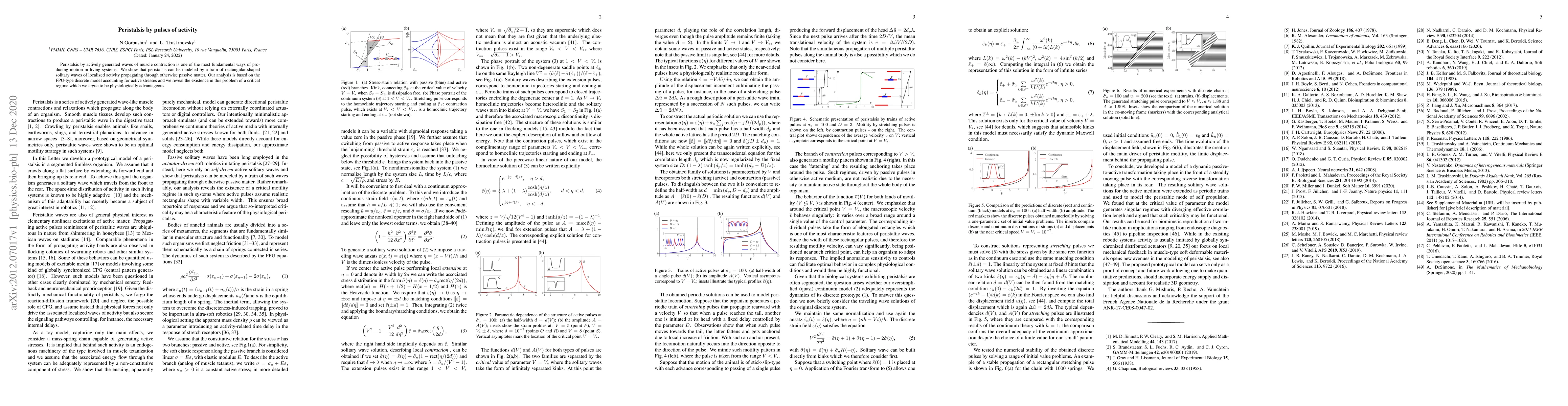 Peristalsis by actively generated waves of muscle contraction is one of the most fundamental ways of producing motion in living systems. We show that peristalsis can be modeled by a train of rectangular-shaped solitary waves of localized activity propagating through otherwise passive matter. Our analysis is based on the FPU-type discrete model accounting for active stresses and we reveal the existence in this problem of a critical regime which we argue to be physiologically advantageous.