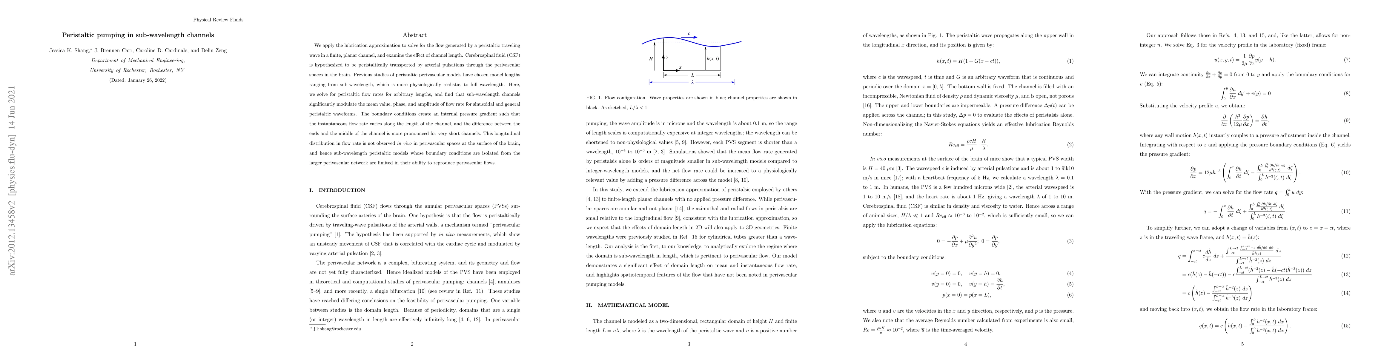 This paper investigates peristaltic flow in sub-wavelength channels using lubrication approximation, finding significant modulation in flow rate's mean value, phase, and amplitude. Sub-wavelength models, however, lack the physiological realism needed to replicate observed perivascular flows in vivo due to isolated boundary conditions.