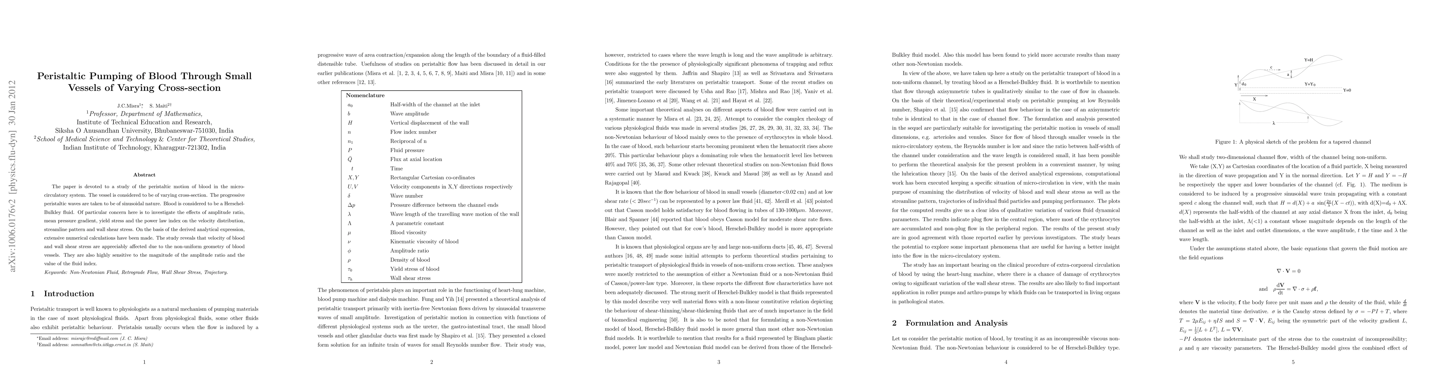 This paper investigates the peristaltic motion of Herschel-Bulkley fluid (blood) through micro-vessels with varying cross-sections, focusing on the effects of amplitude ratio, mean pressure gradient, yield stress, and power law index on velocity distribution, streamline patterns, and wall shear stress. Numerical results show significant impacts of vessel geometry and fluid properties on blood flow dynamics.