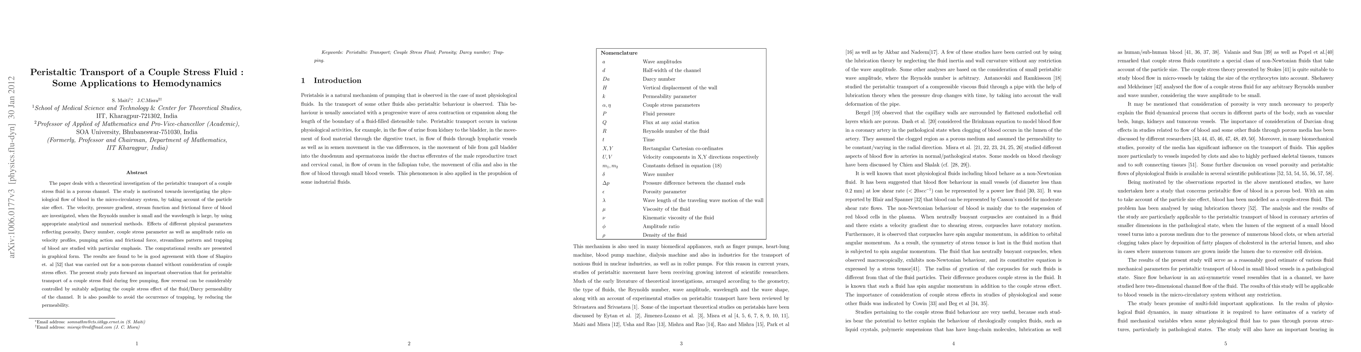 This paper investigates the peristaltic transport of a couple stress fluid in a porous channel, focusing on physiological blood flow in micro-circulatory systems. The study examines the effects of various parameters on velocity profiles, pumping action, and frictional forces, revealing that controlling the couple stress effect and permeability can mitigate flow reversal and trapping phenomena.