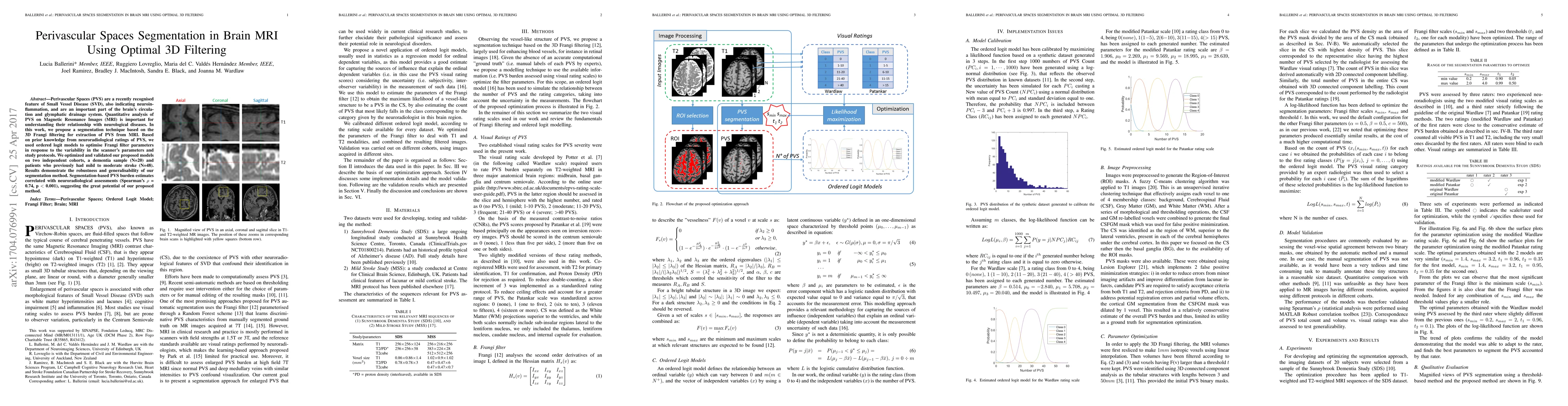 This research proposes a segmentation technique using 3D Frangi filtering for extracting Perivascular Spaces (PVS) from brain MRI scans. Optimized with ordered logit models for scanner variability, the method was validated on dementia and stroke patient cohorts, showing robustness and correlation with neuroradiological assessments (Spearman's $ ho$ = 0.74, p $<$ 0.001), indicating potential for understanding neurological diseases.