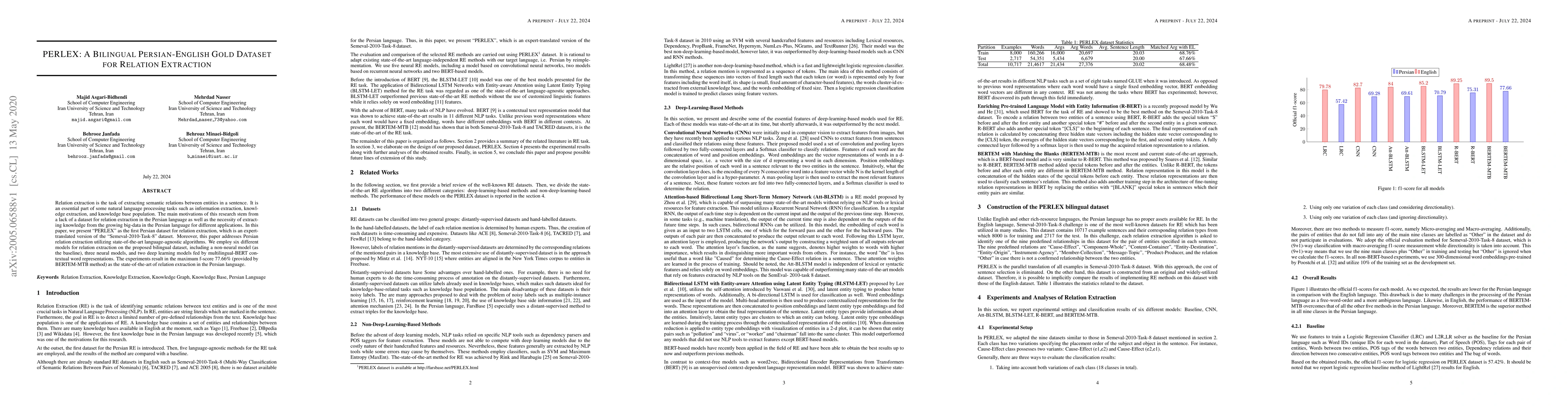 PERLEX is the first bilingual Persian-English dataset for relation extraction, addressing the lack of Persian datasets for this task. The study evaluates six models, achieving a state-of-the-art f-score of 77.66% with BERTEM-MTB.