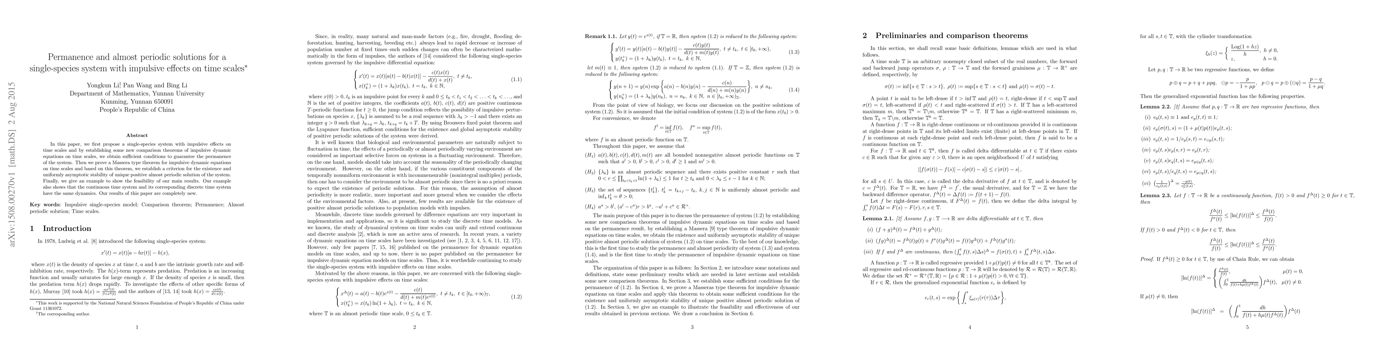 This paper proposes a new single-species system with impulsive effects on time scales, establishing conditions for system permanence and proving the existence and stability of a unique positive almost periodic solution. The results are novel and demonstrated through an example showing equivalence between continuous and discrete time dynamics.