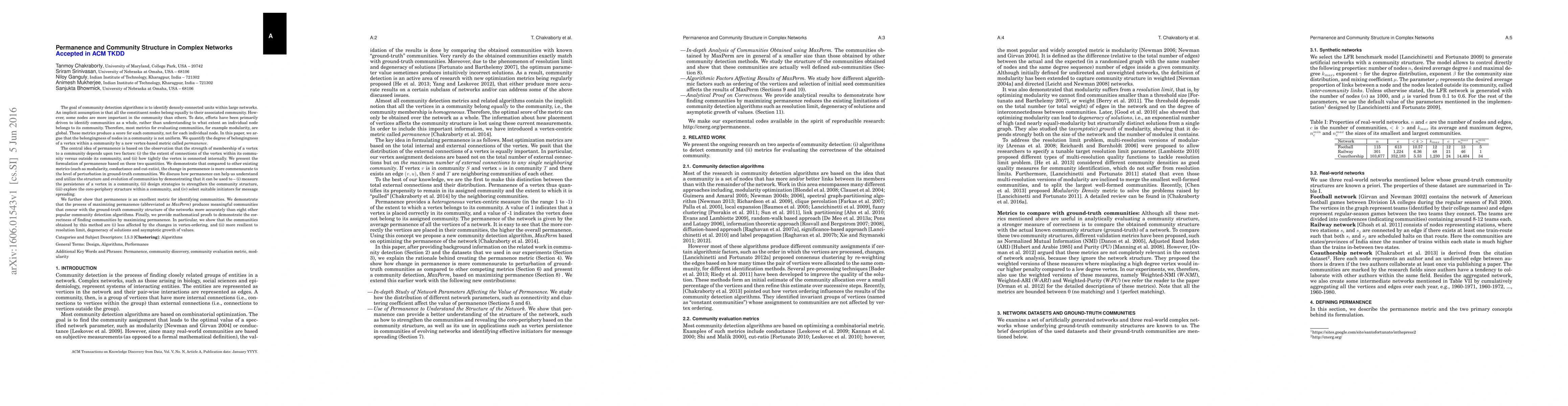 The paper presents the concept of 'permanence' and an algorithm, MaxPerm, for community detection that maximizes permanence, offering a node-centric approach to community analysis.