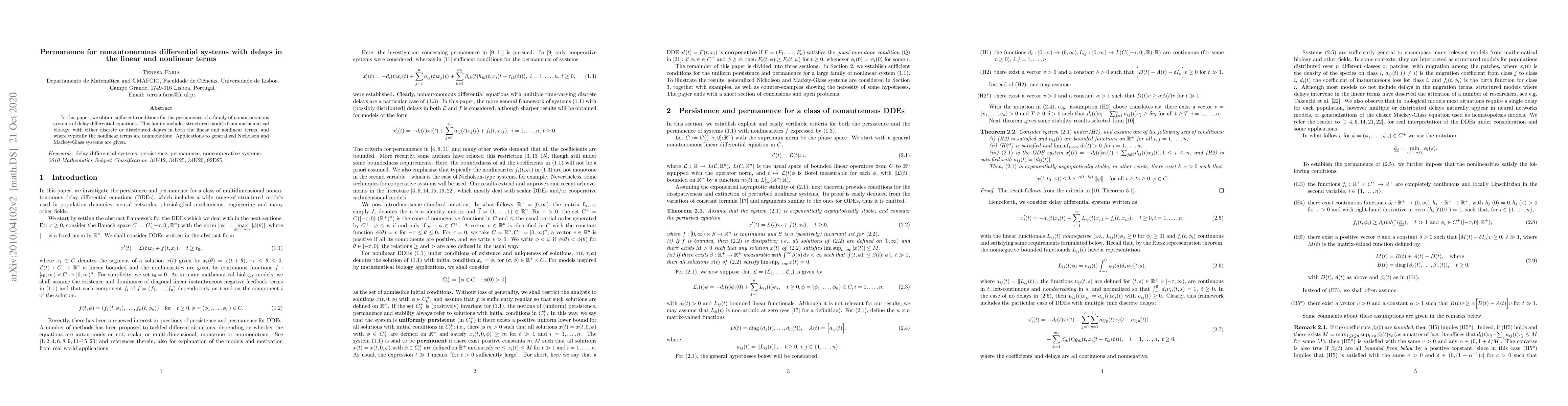 In this paper, we obtain sufficient conditions for the permanence of a family of nonautonomous systems of delay differential equations. This family includes structured models from mathematical biology, with either discrete or distributed delays in both the linear and nonlinear terms, and where typically the nonlinear terms are nonmonotone. Applications to generalized Nicholson or Mackey-Glass systems are given.