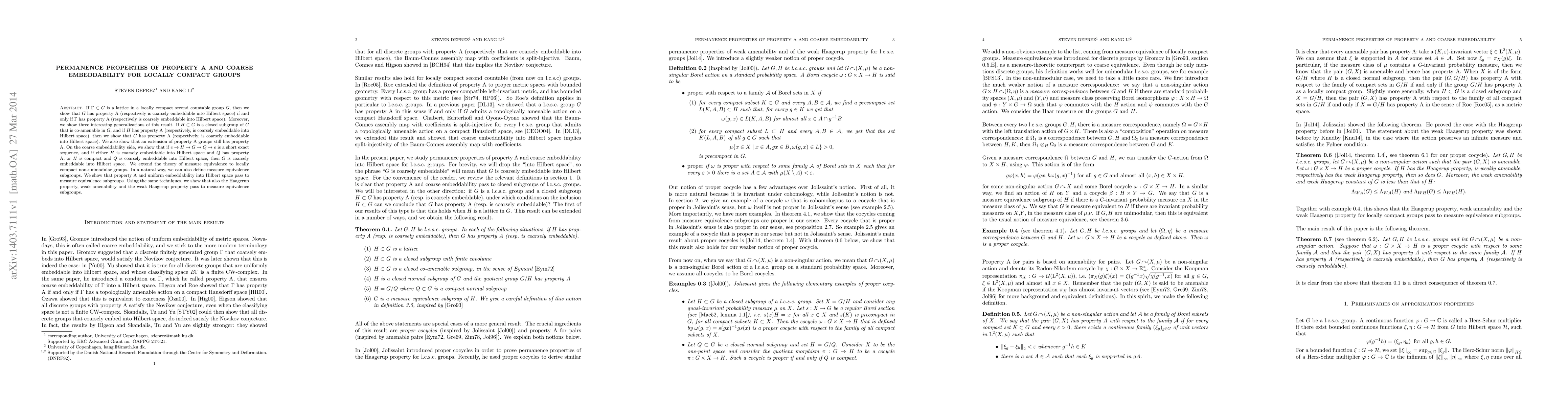 This paper investigates permanence properties of property A and coarse embeddability in locally compact groups, showing that these properties transfer from lattices to the ambient group and from subgroups to the ambient group under certain conditions. It also extends measure equivalence theory to non-unimodular groups and proves that property A, uniform embeddability into Hilbert space, the Haagerup property, weak amenability, and the weak Haagerup property persist in measure equivalence subgroups.