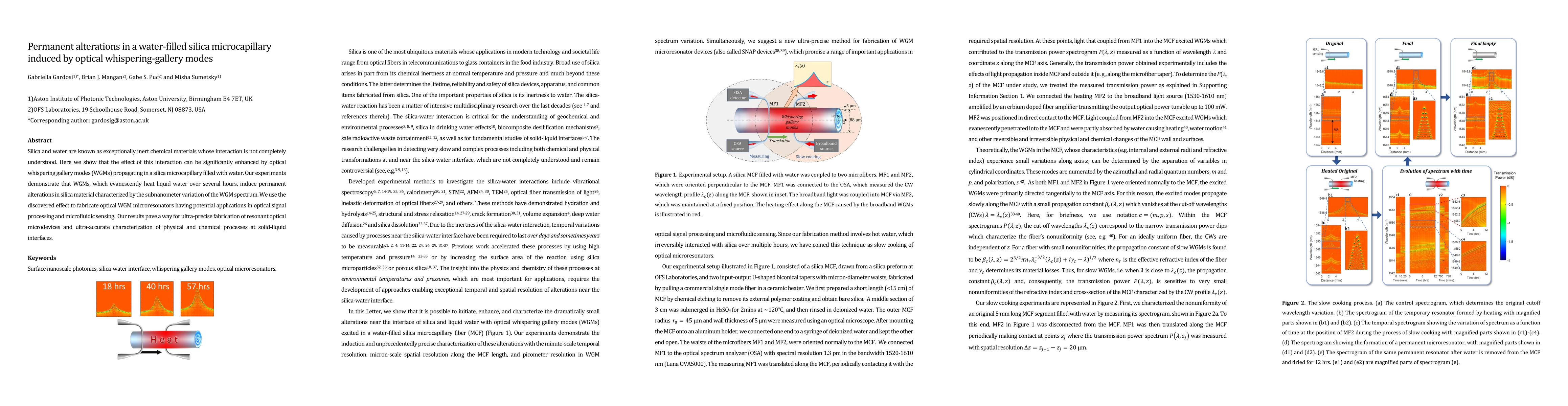 Silica and water are known as exceptionally inert chemical materials whose interaction is not completely understood. Here we show that the effect of this interaction can be significantly enhanced by optical whispering gallery modes (WGMs) propagating in a silica microcapillary filled with water. Our experiments demonstrate that WGMs, which evanescently heat liquid water over several hours, induce permanent alterations in silica material characterized by the subnanometer variation of the WGM spectrum. We use the discovered effect to fabricate optical WGM microresonators having potential applications in optical signal processing and microfluidic sensing. Our results pave a way for ultra-precise fabrication of resonant optical microdevices and ultra-accurate characterization of physical and chemical processes at solid-liquid interfaces.