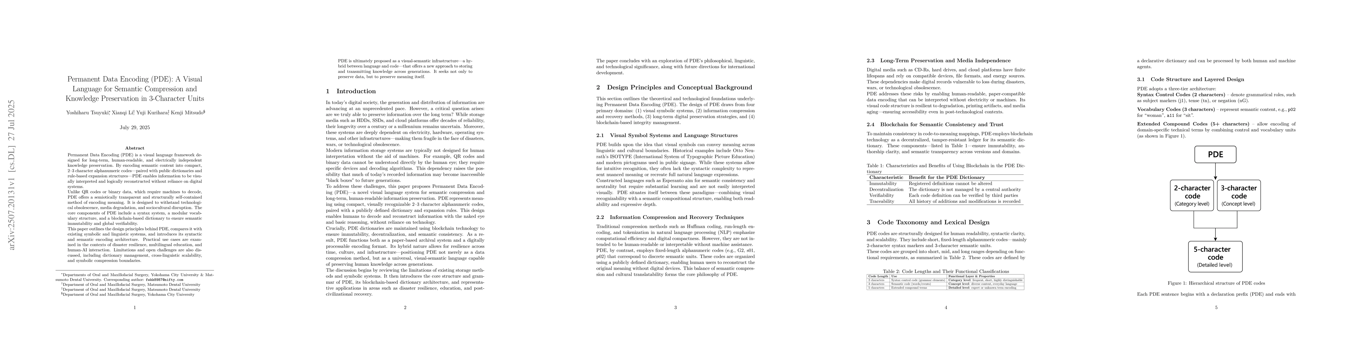 Permanent Data Encoding (PDE) is a visual language framework designed for long-term, human-readable, and electrically independent knowledge preservation. By encoding semantic content into compact 2-3 character alphanumeric codes, paired with public dictionaries and rule-based expansion structures, PDE enables information to be visually interpreted and logically reconstructed without reliance on digital systems. Unlike QR codes or binary data, PDE offers a transparent and self-contained method of encoding meaning. This paper outlines the PDE syntax, dictionary protocol, use cases in disaster resilience and AI integration, and its implications as a cross-generational semantic infrastructure.