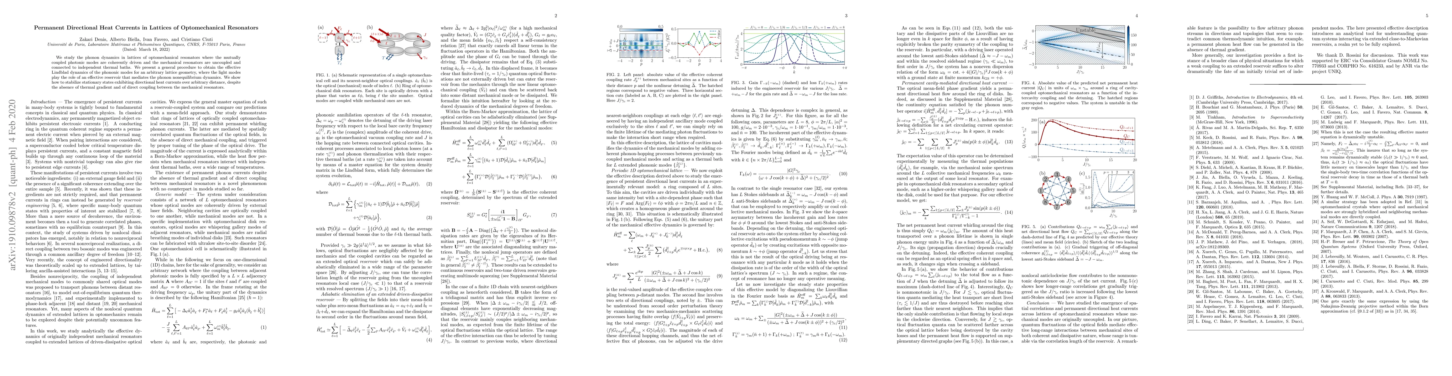 We study the phonon dynamics in lattices of optomechanical resonators where the mutually coupled photonic modes are coherently driven and the mechanical resonators are uncoupled and connected to independent thermal baths. We present a general procedure to obtain the effective Lindblad dynamics of the phononic modes for an arbitrary lattice geometry, where the light modes play the role of an effective reservoir that mediates the phonon nonequilibrium dynamics. We show how to stabilize stationary states exhibiting directional heat currents over arbitrary distance, despite the absence of thermal gradient and of direct coupling between the mechanical resonators.