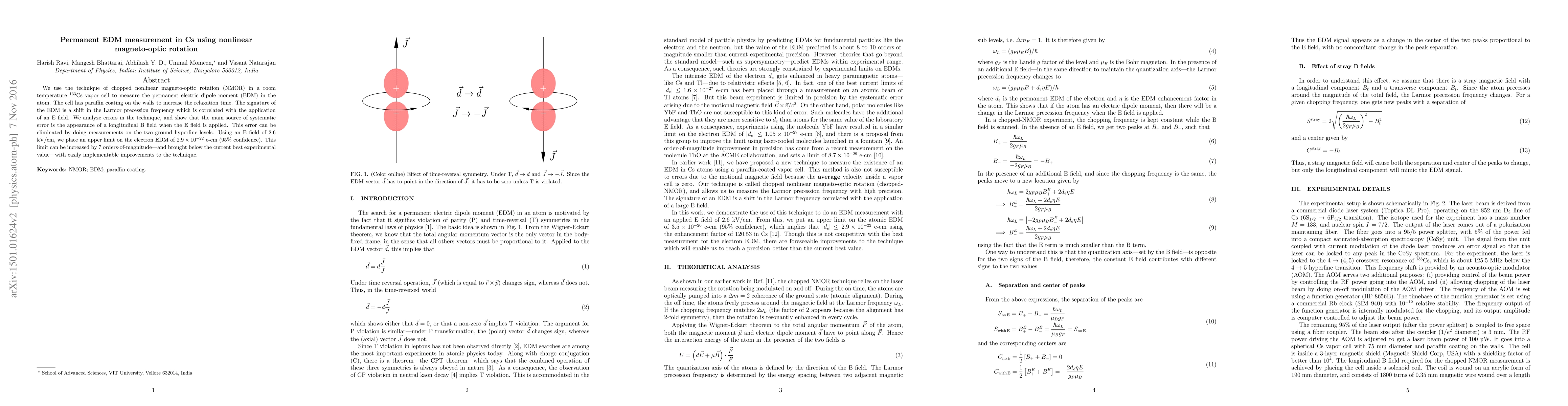 We use the technique of chopped nonlinear magneto-optic rotation (NMOR) in a room temperature $^{133}$Cs vapor cell to measure the permanent electric dipole moment (EDM) in the atom. The cell has paraffin coating on the walls to increase the relaxation time. The signature of the EDM is a shift in the Larmor precession frequency which is correlated with the application of an E field. We analyze errors in the technique, and show that the main source of systematic error is the appearance of a longitudinal B field when the E field is applied. This error can be eliminated by doing measurements on the two ground hyperfine levels. Using an E field of 2.6 kV/cm, we place an upper limit on the electron EDM of $ 2.9 \times 10^{-22} $ e-cm ($95 \%$ confidence). This limit can be increased by 7 orders-of-magnitude---and brought below the current best experimental value---with easily implementable improvements to the technique.