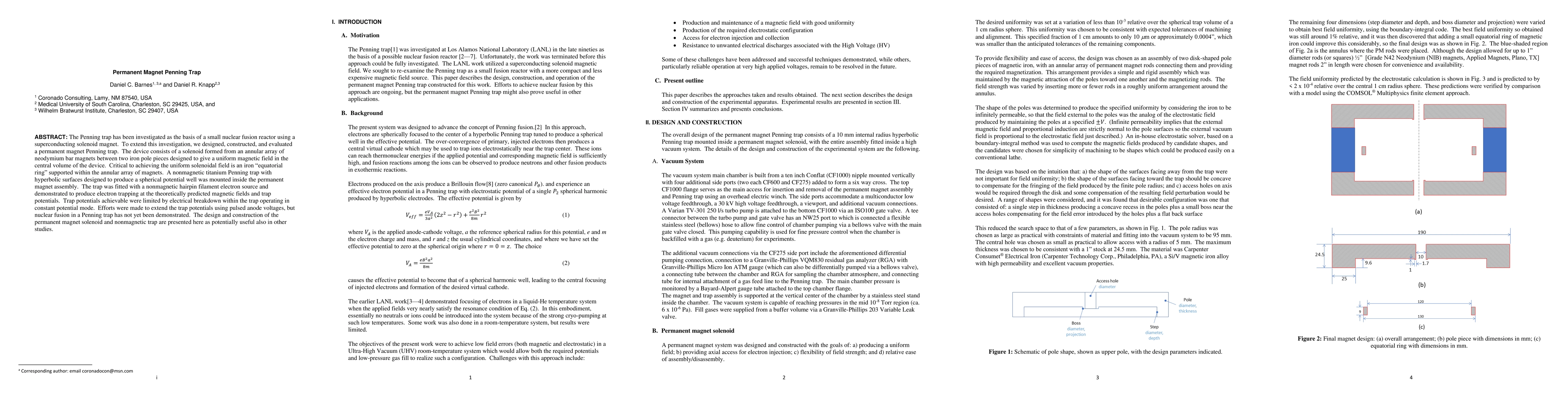 This research paper details the design and evaluation of a permanent magnet Penning trap intended for nuclear fusion studies, using a solenoid formed from neodymium magnets and iron pole pieces to create a uniform magnetic field. Despite successful electron trapping and potential enhancements, nuclear fusion remains undemonstrated, indicating ongoing challenges.
