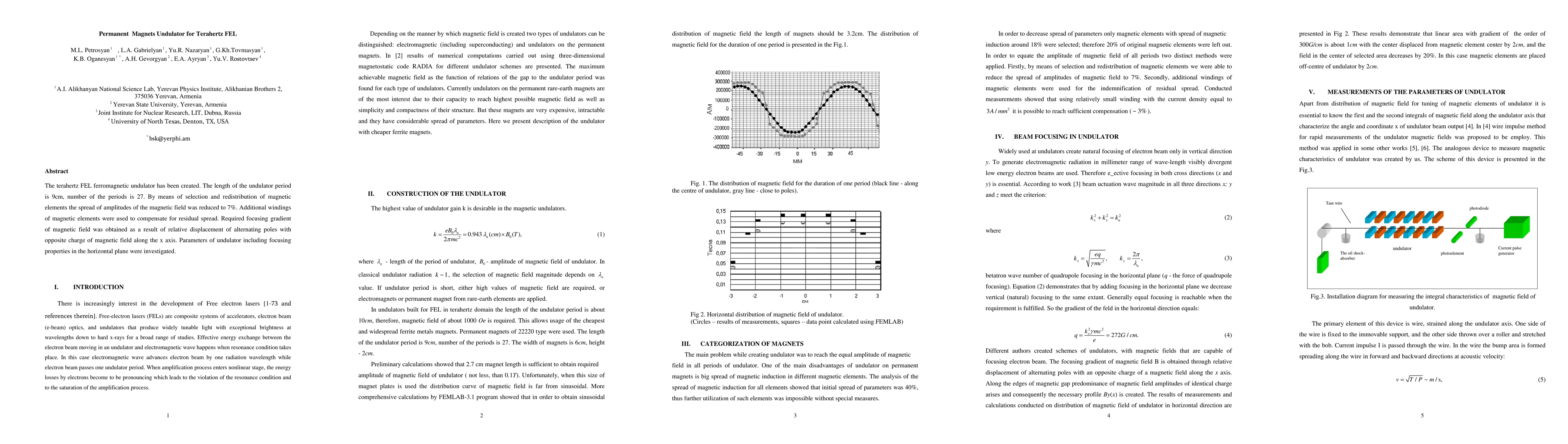 The terahertz FEL ferromagnetic undulator has been created. The length of the undulator period is 9cm, number of the periods is 27. By means of selection and redistribution of magnetic elements the spread of amplitudes of the magnetic field was reduced to 7%. Additional windings of magnetic elements were used to compensate for residual spread. Required focusing gradient of magnetic field was obtained as a result of relative displacement of alternating poles with opposite charge of magnetic field along the x axis. Parameters of undulator including focusing properties in the horizontal plane were investigated.