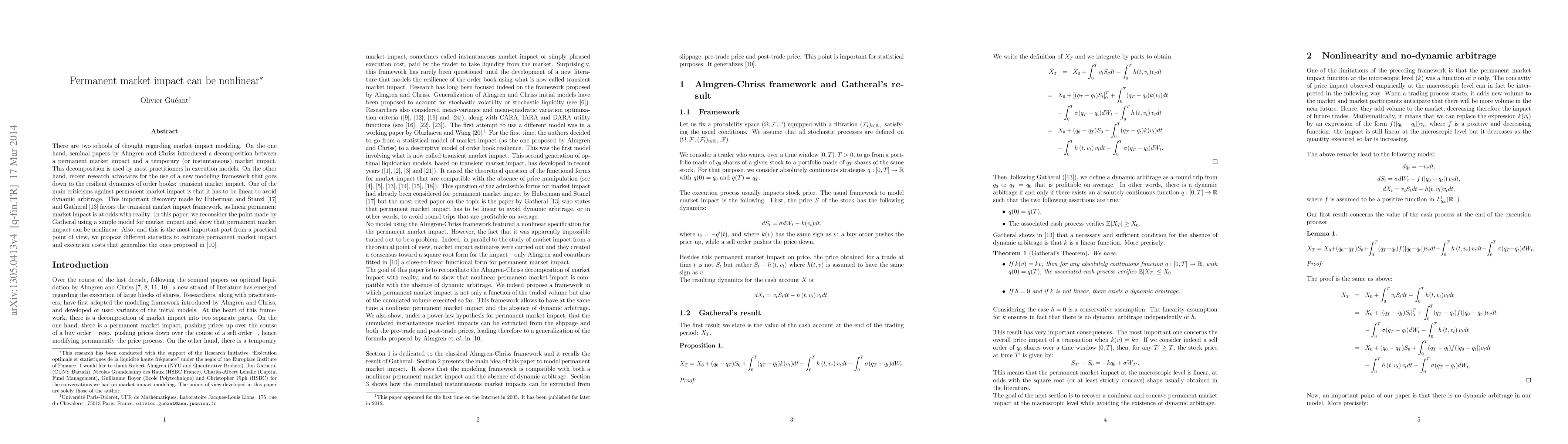 There are two schools of thought regarding market impact modeling. On the one hand, seminal papers by Almgren and Chriss introduced a decomposition between a permanent market impact and a temporary (or instantaneous) market impact. This decomposition is used by most practitioners in execution models. On the other hand, recent research advocates for the use of a new modeling framework that goes down to the resilient dynamics of order books: transient market impact. One of the main criticisms against permanent market impact is that it has to be linear to avoid dynamic arbitrage. This important discovery made by Huberman and Stanzl and Gatheral favors the transient market impact framework, as linear permanent market impact is at odds with reality. In this paper, we reconsider the point made by Gatheral using a simple model for market impact and show that permanent market impact can be nonlinear. Also, and this is the most important part from a practical point of view, we propose different statistics to estimate permanent market impact and execution costs that generalize the ones proposed in Almgren at al. (2005).