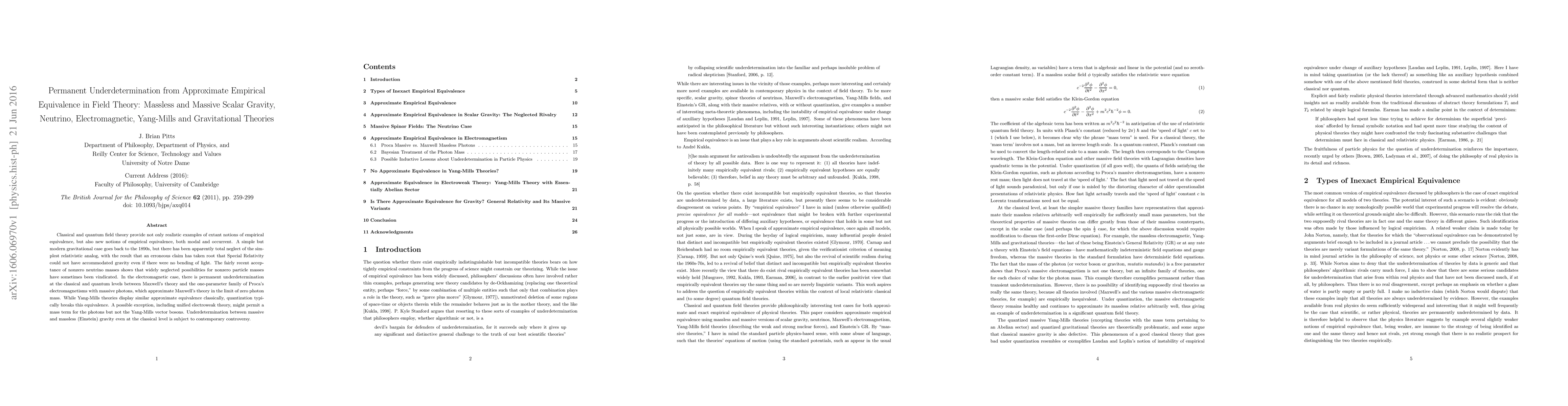 Classical and quantum field theory provide not only realistic examples of extant notions of empirical equivalence, but also new notions of empirical equivalence, both modal and occurrent. A simple but modern gravitational case goes back to the 1890s, but there has been apparently total neglect of the simplest relativistic analog, with the result that an erroneous claim has taken root that Special Relativity could not have accommodated gravity even if there were no bending of light. The fairly recent acceptance of nonzero neutrino masses shows that widely neglected possibilities for nonzero particle masses have sometimes been vindicated. In the electromagnetic case, there is permanent underdetermination at the classical and quantum levels between Maxwell's theory and the one-parameter family of Proca's electromagnetisms with massive photons, which approximate Maxwell's theory in the limit of zero photon mass. While Yang-Mills theories display similar approximate equivalence classically, quantization typically breaks this equivalence. A possible exception, including unified electroweak theory, might permit a mass term for the photons but not the Yang-Mills vector bosons. Underdetermination between massive and massless (Einstein) gravity even at the classical level is subject to contemporary controversy.