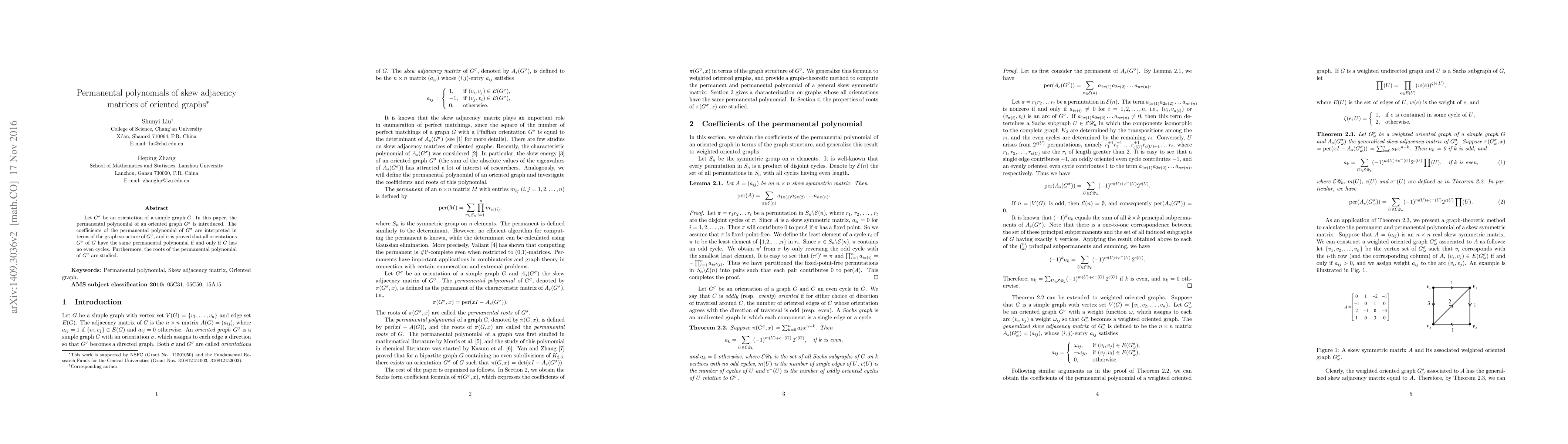 This paper introduces permanental polynomials for oriented graphs and interprets their coefficients in terms of the graph's structure. It proves that all orientations of a simple graph have the same permanental polynomial if and only if the graph has no even cycles, and studies the roots of these polynomials.