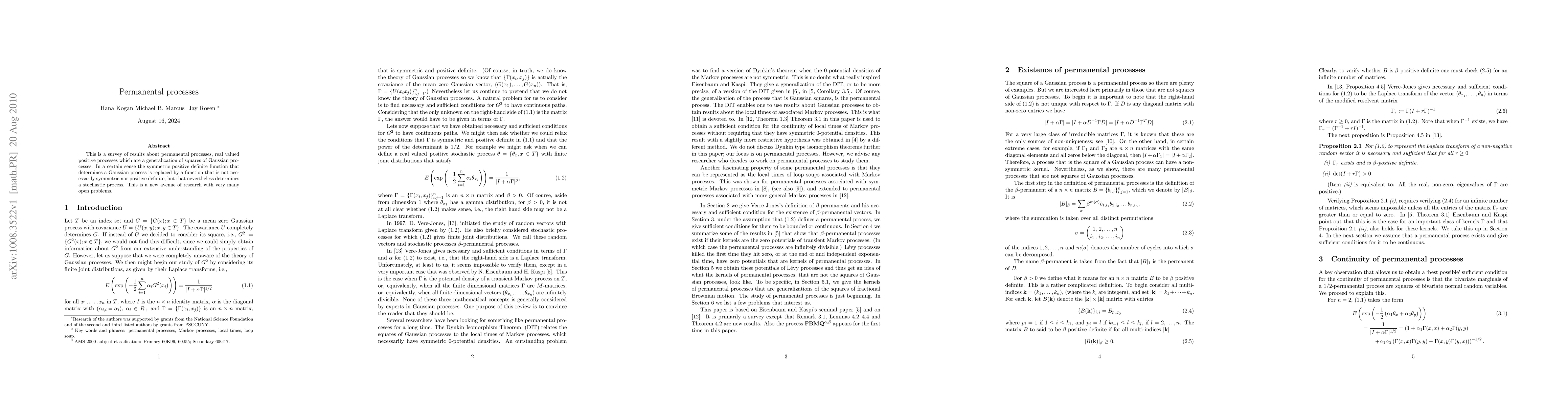 This is a survey of results about permanental processes, real valued positive processes which are a generalization of squares of Gaussian processes. In a certain sense the symmetric positive definite function that determines a Gaussian process is replaced by a function that is not necessarily symmetric nor positive definite, but that nevertheless determines a stochastic process. This is a new avenue of research with very many open problems.
