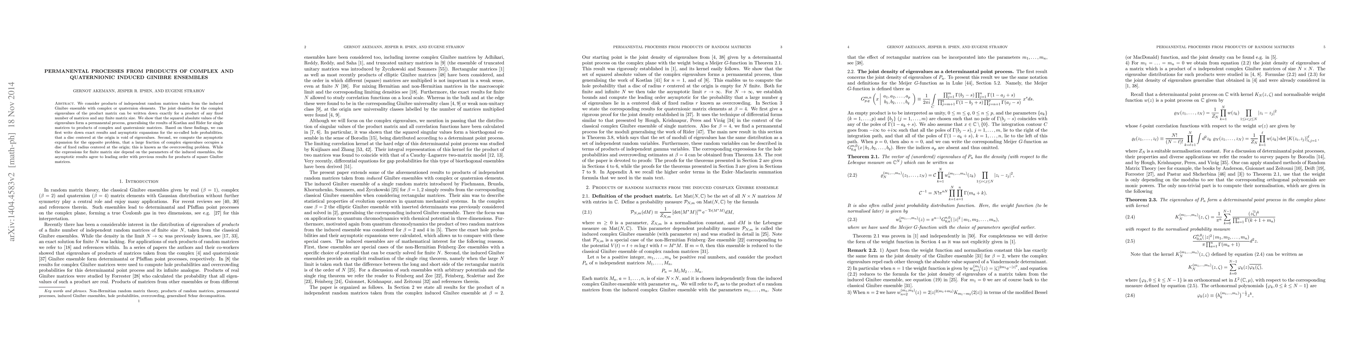 This paper investigates products of random matrices from induced Ginibre ensembles with complex and quaternionic elements, showing that the squared absolute values of their eigenvalues form a permanental process. The study provides exact results and asymptotic expansions for both hole and overcrowding probabilities in the eigenvalue distributions.