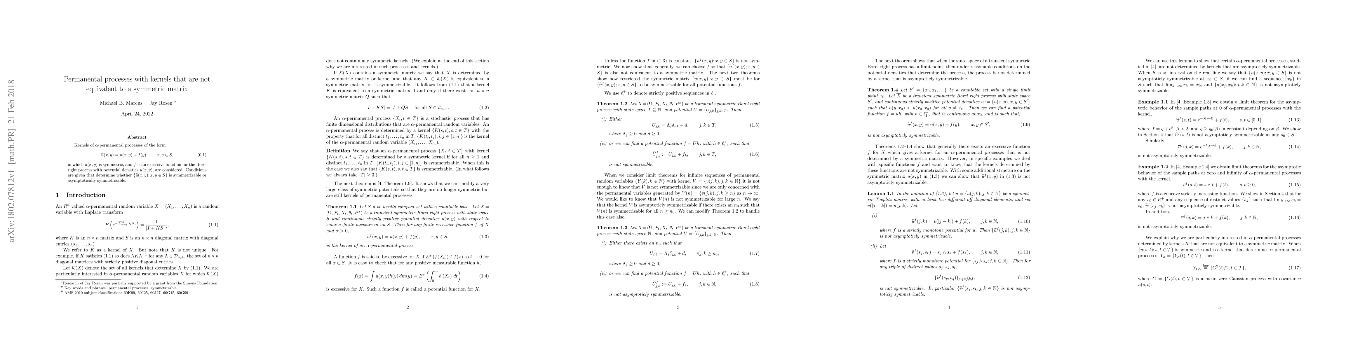 Kernels of $\alpha$-permanental processes of the form \[ v(x,y)=u(x,y)+f(y),\qquad x,y\in S, \] in which $u(x,y)$ is symmetric, and $f$ is an excessive function for the Borel right process with potential densities $u(x,y)$, are considered. Conditions are given that determine whether $\{v(x,y);x,y\in S\}$ is symmetrizable or asymptotically symmetrizable.