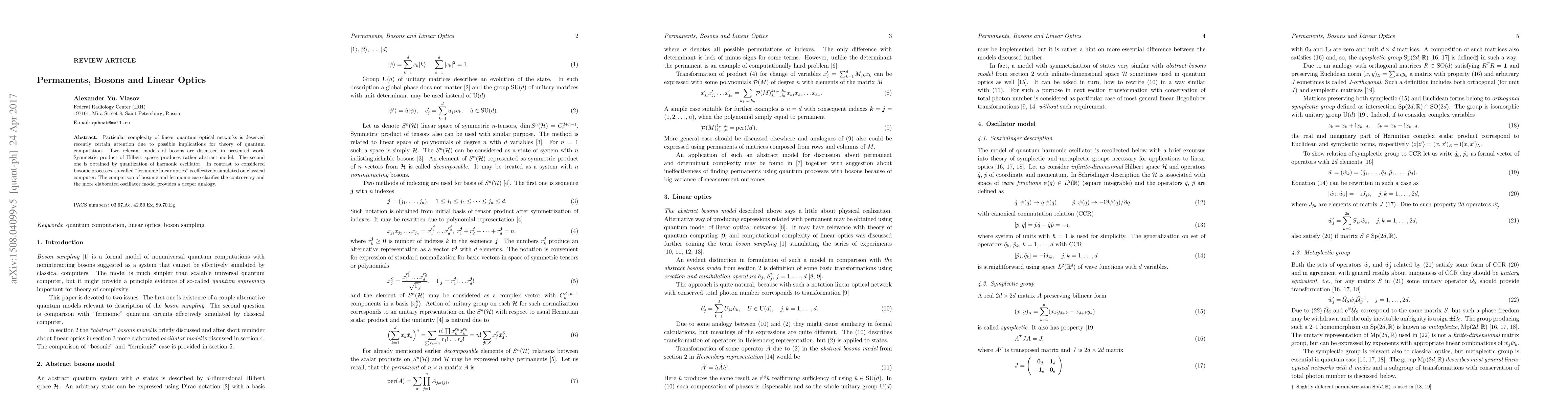 Particular complexity of linear quantum optical networks is deserved recently certain attention due to possible implications for theory of quantum computation. Two relevant models of bosons are discussed in presented work. Symmetric product of Hilbert spaces produces rather abstract model. The second one is obtained by quantization of harmonic oscillator. In contrast to considered bosonic processes, so-called "fermionic linear optics" is effectively simulated on classical computer. The comparison of bosonic and fermionic case clarifies the controversy and the more elaborated oscillator model provides a deeper analogy.