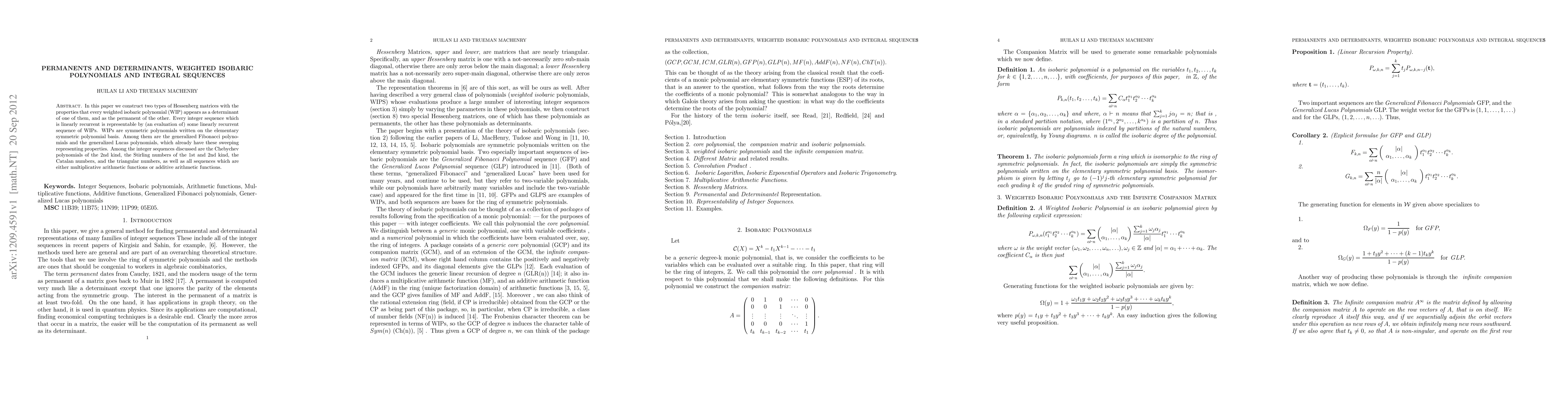 In this paper we construct two types of Hessenberg matrices with the properties that every weighted isobaric polynomial (WIP) appears as a determinant of one of them, and as the permanent of the other. Every integer sequence which is linearly recurrent is representable by (an evaluation of) some linearly recurrent sequence of WIPs. WIPs are symmetric polynomials written on the elementary symmetric polynomial basis. Among them are the generalized Fibonacci polynomials and the generalized Lucas polynomials, which already have these sweeping representing properties. Among the integer sequences discussed are the Chebychev polynomials of the 2nd kind, the Stirling numbers of the 1st and 2nd kind, the Catalan numbers, and the triangular numbers, as well as all sequences which are either multiplicative arithmetic functions or additive arithmetic functions.