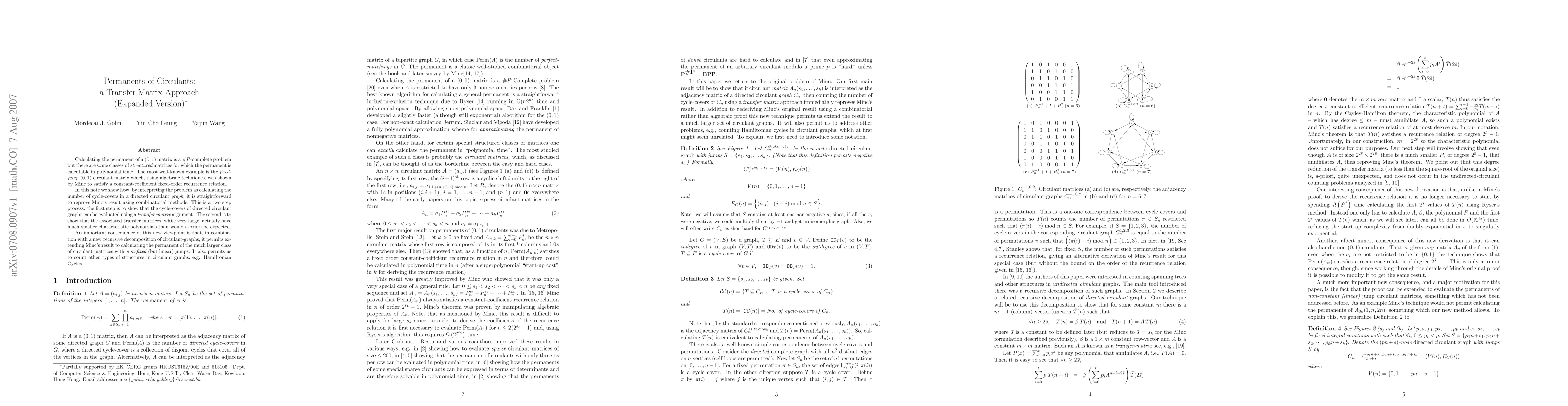 Calculating the permanent of a (0,1) matrix is a #P-complete problem but there are some classes of structured matrices for which the permanent is calculable in polynomial time. The most well-known example is the fixed-jump (0,1) circulant matrix which, using algebraic techniques, was shown by Minc to satisfy a constant-coefficient fixed-order recurrence relation. In this note we show how, by interpreting the problem as calculating the number of cycle-covers in a directed circulant graph, it is straightforward to reprove Minc's result using combinatorial methods. This is a two step process: the first step is to show that the cycle-covers of directed circulant graphs can be evaluated using a transfer matrix argument. The second is to show that the associated transfer matrices, while very large, actually have much smaller characteristic polynomials than would a-priori be expected. An important consequence of this new viewpoint is that, in combination with a new recursive decomposition of circulant-graphs, it permits extending Minc's result to calculating the permanent of the much larger class of circulant matrices with non-fixed (but linear) jumps. It also permits us to count other types of structures in circulant graphs, e.g., Hamiltonian Cycles.