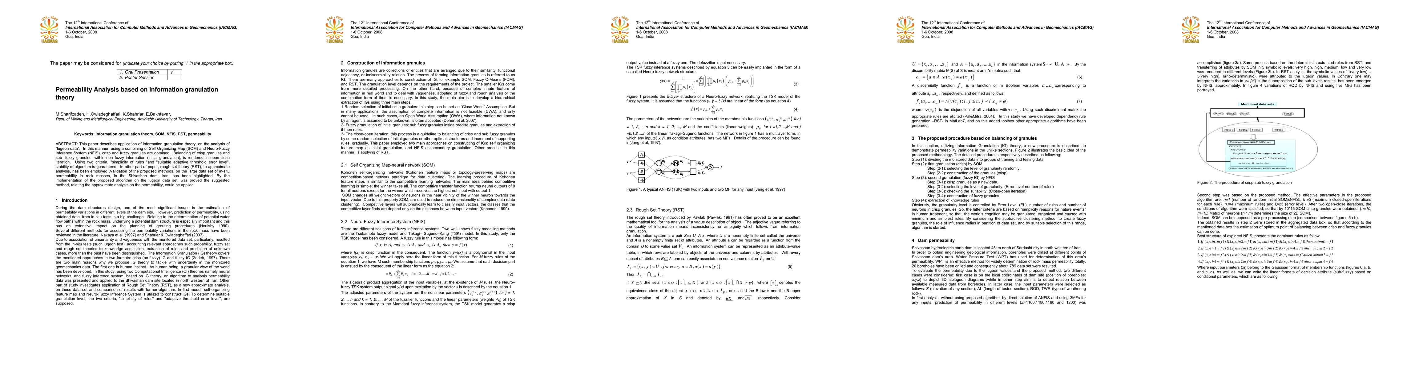 This paper describes application of information granulation theory, on the analysis of "lugeon data". In this manner, using a combining of Self Organizing Map (SOM) and Neuro-Fuzzy Inference System (NFIS), crisp and fuzzy granules are obtained. Balancing of crisp granules and sub- fuzzy granules, within non fuzzy information (initial granulation), is rendered in open-close iteration. Using two criteria, "simplicity of rules "and "suitable adaptive threshold error level", stability of algorithm is guaranteed. In other part of paper, rough set theory (RST), to approximate analysis, has been employed >.Validation of the proposed methods, on the large data set of in-situ permeability in rock masses, in the Shivashan dam, Iran, has been highlighted. By the implementation of the proposed algorithm on the lugeon data set, was proved the suggested method, relating the approximate analysis on the permeability, could be applied.