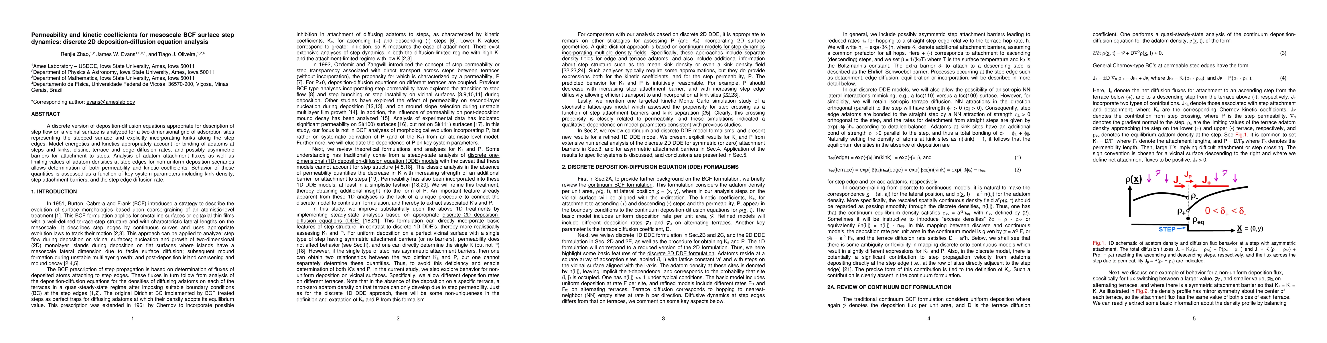 A discrete version of deposition-diffusion equations appropriate for description of step flow on a vicinal surface is analyzed for a two-dimensional grid of adsorption sites representing the stepped surface and explicitly incorporating kinks along the step edges. Model energetics and kinetics appropriately account for binding of adatoms at steps and kinks, distinct terrace and edge diffusion rates, and possibly asymmetric barriers for attachment to steps. Analysis of adatom attachment fluxes as well as limiting values of adatom densities at step edges for non-uniform deposition scenarios allows determination of both permeability and kinetic coefficients. Behavior of these quantities is assessed as a function of key system parameters including kink density, step attachment barriers, and the step edge diffusion rate.