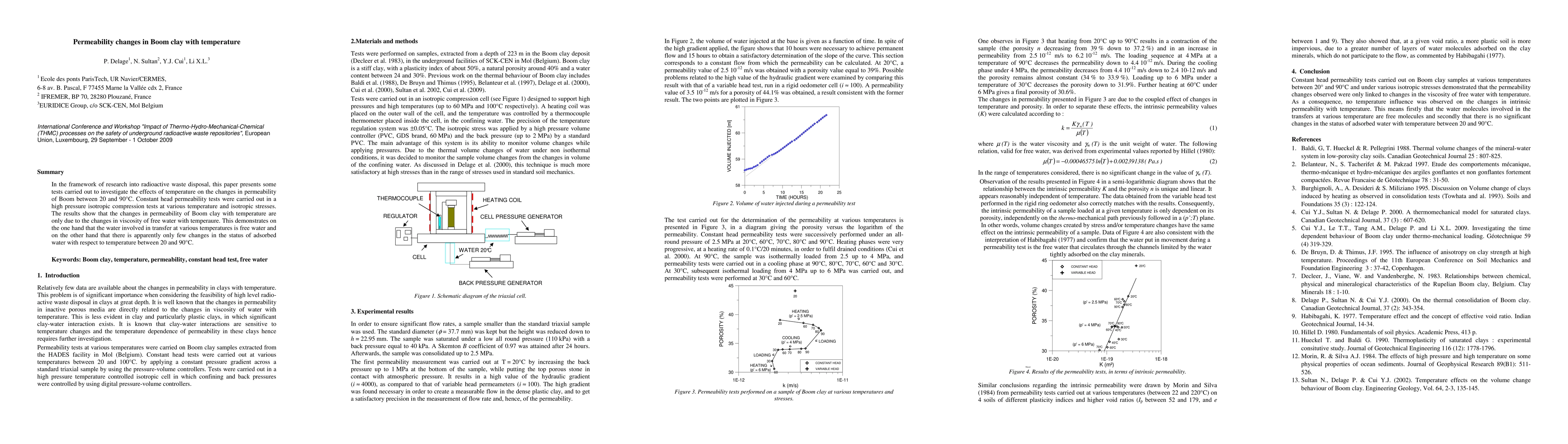 In the framework of research into radioactive waste disposal, this paper presents some tests carried out to investigate the effects of temperature on the changes in permeability of Boom between 20 and 90 deg C. Constant head permeability tests were carried out in a high pressure isotropic compression tests at various temperature and isotropic stresses. The results show that the changes in permeability of Boom clay with temperature are only due to the changes in viscosity of free water with temperaure. This demonstrates on the one hand that the water involved in transfer at various temperatures is free water and on the other hand that there is apparently only few changes in the status of adsorbed water with respect to temperature between 20 and 90 deg C.