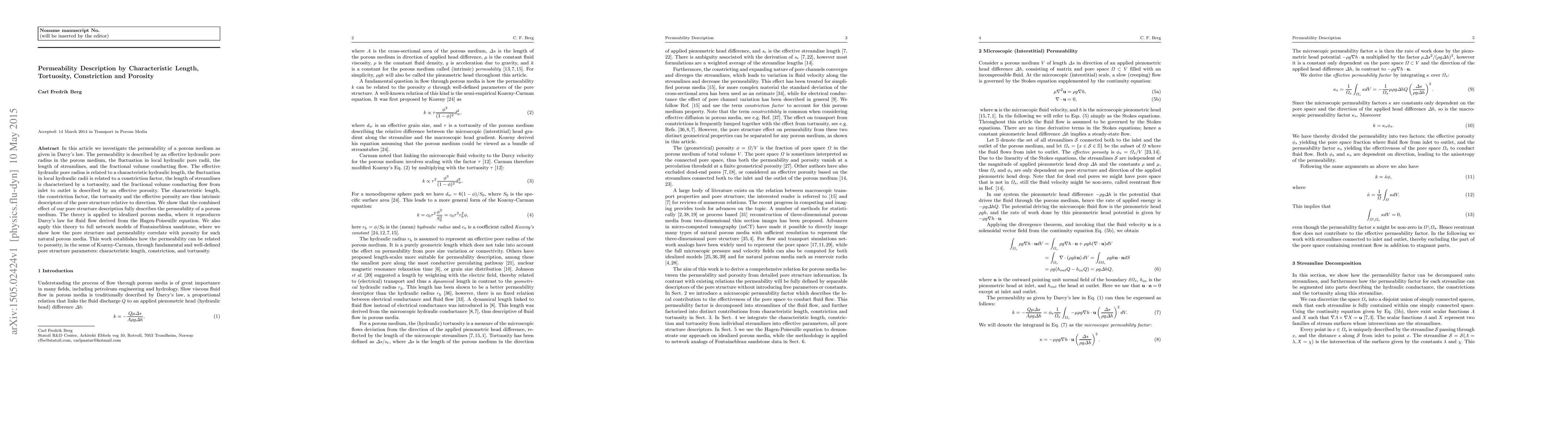 This paper investigates permeability in porous media using Darcy's law, describing it through characteristic length, tortuosity, constriction, and porosity. The study applies this theory to idealized and real sandstone models, demonstrating its effectiveness in correlating permeability with porosity via defined pore structure parameters.