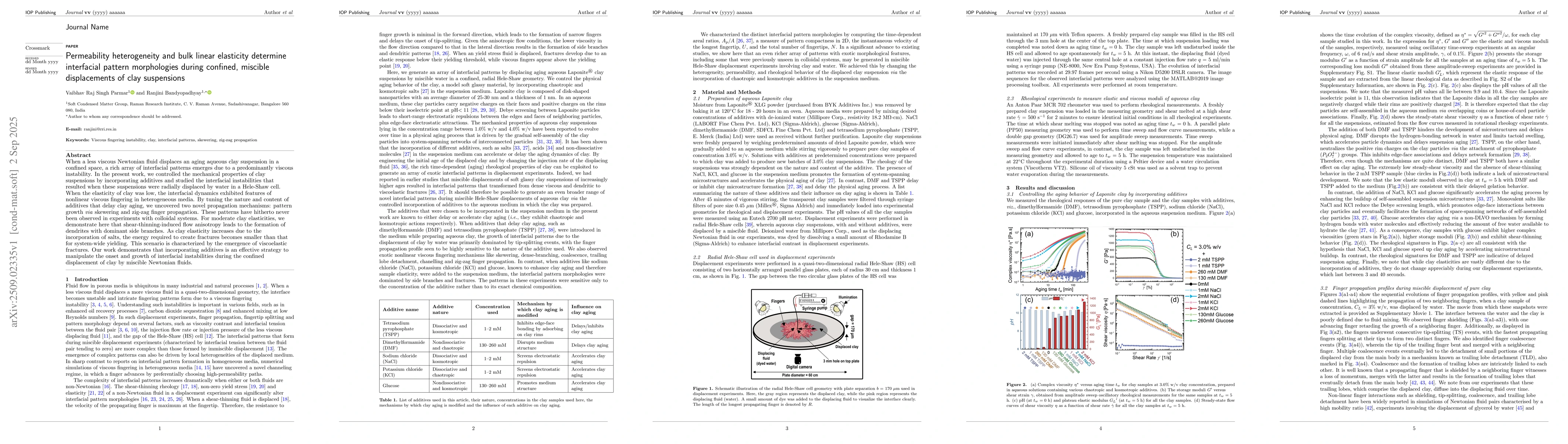 When a less viscous Newtonian fluid displaces an aging aqueous clay suspension in a confined space, a rich array of interfacial patterns emerges due to a predominantly viscous instability. In the present work, we controlled the mechanical properties of clay suspensions by incorporating additives and studied the interfacial instabilities that resulted when these suspensions were radially displaced by water in a Hele-Shaw cell. When the elasticity of clay was low, the interfacial dynamics exhibited features of nonlinear viscous fingering in heterogeneous media. By tuning the nature and content of additives that delay clay aging, we uncovered two novel propagation mechanisms: pattern growth via skewering and zig-zag finger propagation. These patterns have hitherto never been observed in experiments with colloidal systems. For moderate clay elasticities, we demonstrate here that shear-thinning-induced flow anisotropy leads to the formation of dendrites with dominant side branches. As clay elasticity increases due to the incorporation of salts, the energy required to create fractures becomes smaller than that for system-wide yielding. This scenario is characterized by the emergence of viscoelastic fractures. Our work demonstrates that incorporating additives is an effective strategy to manipulate the onset and growth of interfacial instabilities during the confined displacement of clay by miscible Newtonian fluids.