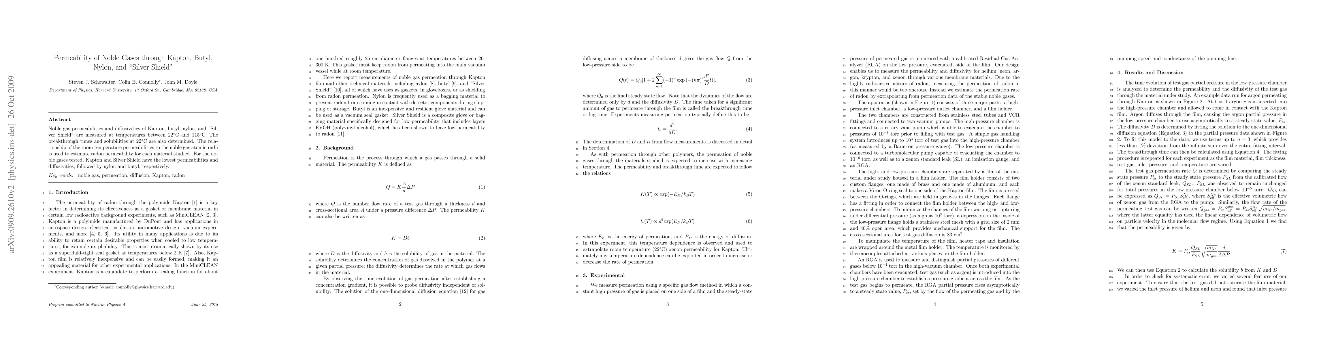 Noble gas permeabilities and diffusivities of Kapton, butyl, nylon, and "Silver Shield" are measured at temperatures between 22C and 115C. The breakthrough times and solubilities at 22C are also determined. The relationship of the room temperature permeabilities to the noble gas atomic radii is used to estimate radon permeability for each material studied. For the noble gases tested, Kapton and Silver Shield have the lowest permeabilities and diffusivities, followed by nylon and butyl, respectively.